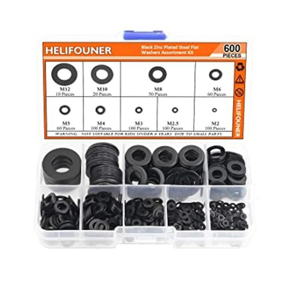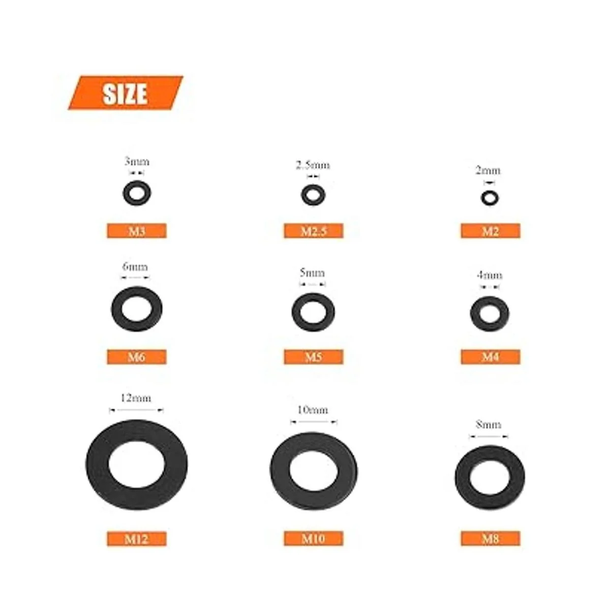 Tamaño: M2 M2.5 M3 M4 M5 M6 M8 M10 M12, un total de 600 piezas/9 tamaños de las arandelas más utilizadas en una caja de plástico, diferentes tamaños pueden satisfacer tus diferentes necesidades.