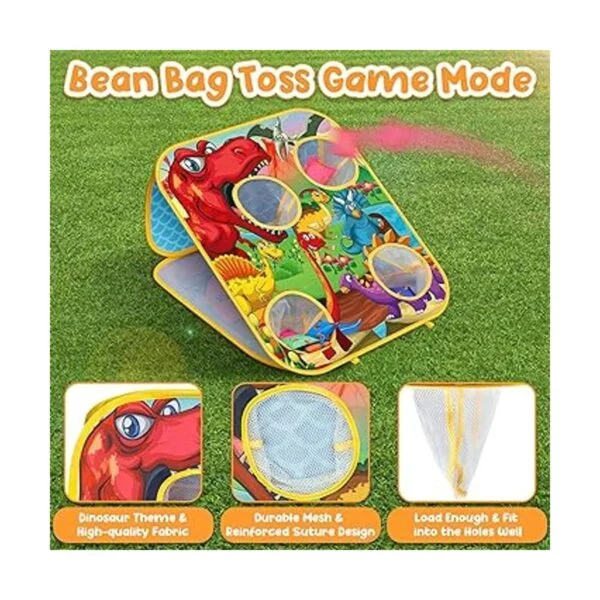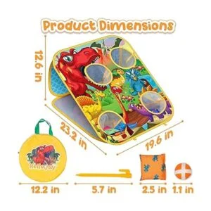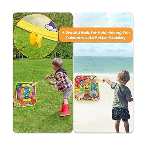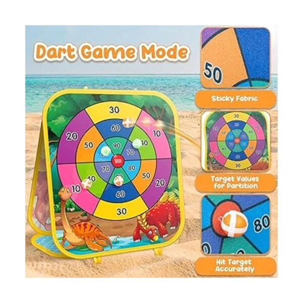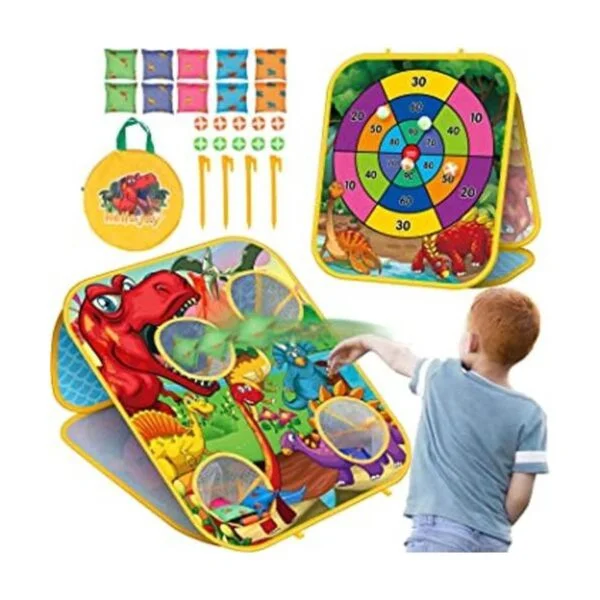 Juego de lanzamiento de puf 2 en 1: juego de gran diseño para interiores y exteriores para niños pequeños, este juego de agujero de maíz con temática de dinosaurio combina 2 juegos con un juego de lanzamiento horizontal más fácil y un juego de dardos verticales más duro. El agujero adecuado se puede tirar en los puf, las bolas con adhesivo se pueden dardos con precisión. Reunión con niños para explorar una variedad de experiencias de juego