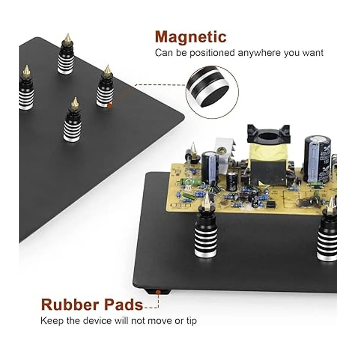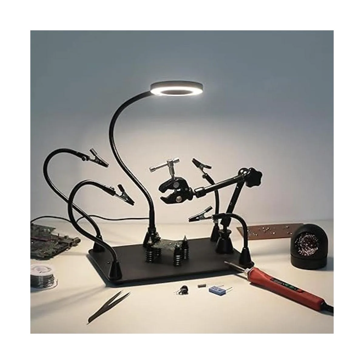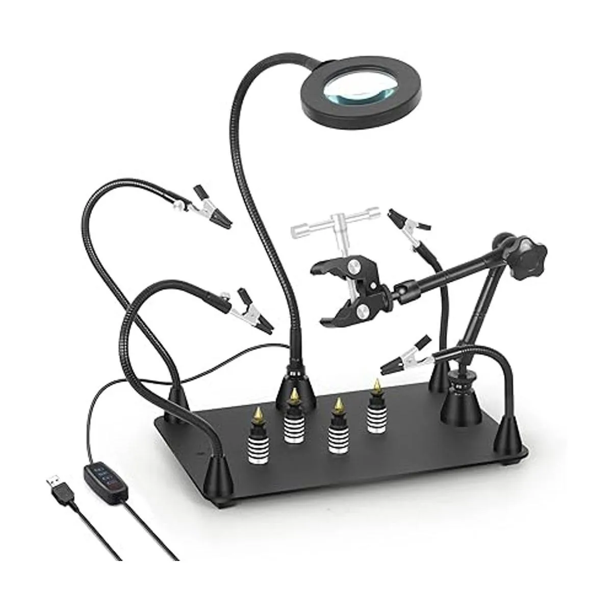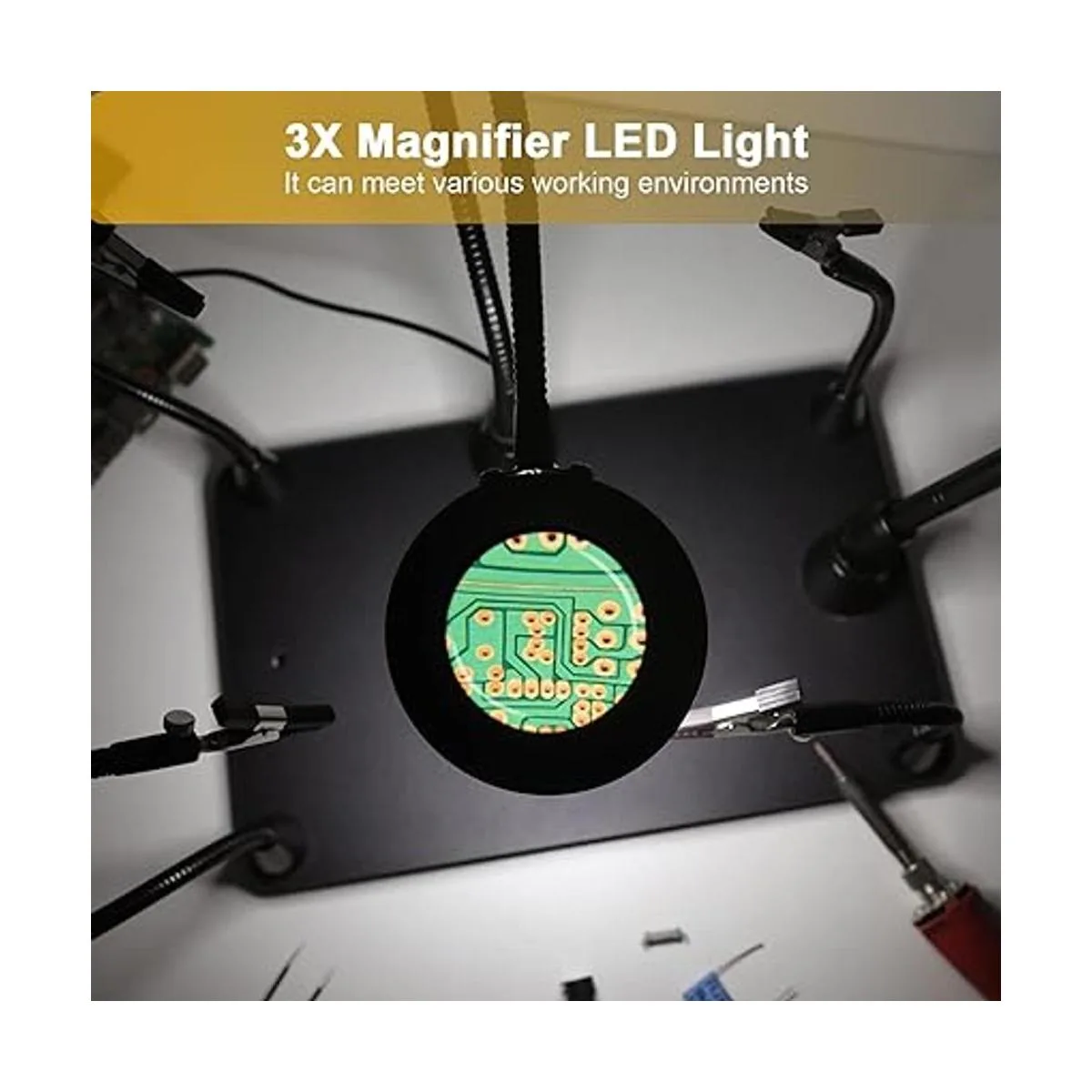 Helping Hands Soporte magnético para placa de circuito de soldadura, herramientas de tercera mano con lámpara de aumento LED 3X, soporte para pistola de aire caliente 360, brazos de metal flexibles, base resistente, herramienta de reparación electrónica, mano mágica
