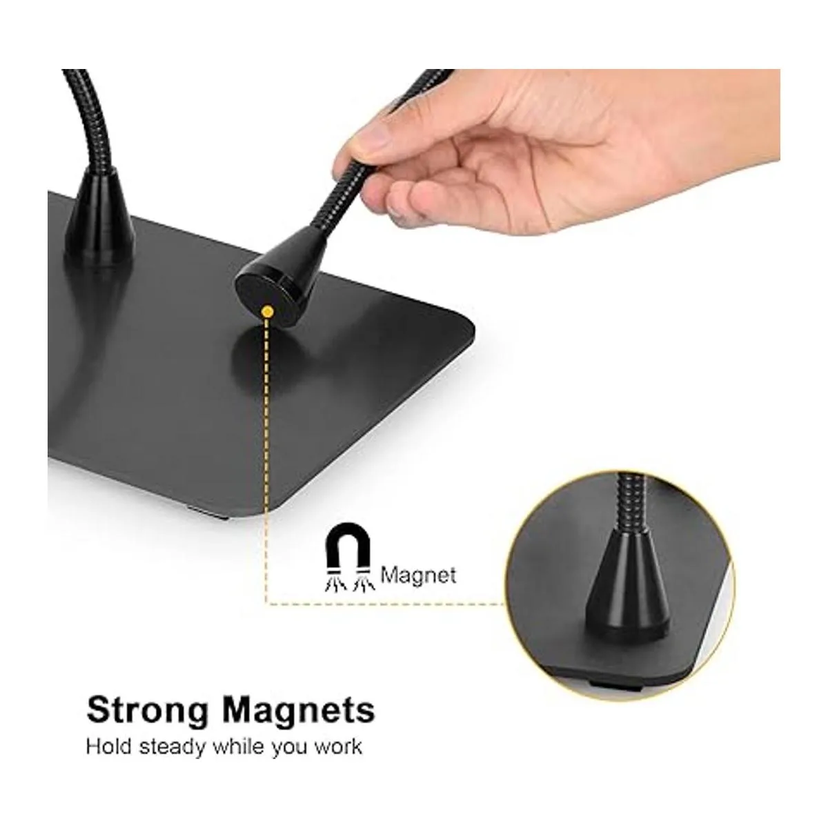 Brazos flexibles magnéticos: 4 brazos de cuello de cisne de metal ajustables con una fuerte base magnética, que tienen una gran atracción por la base de acero. Incluimos dos brazos de 9 pulgadas, dos brazos de 4.5 pulgadas que ayudan a los brazos de mano, libera completamente tus manos y trabaja más fácil que nunca