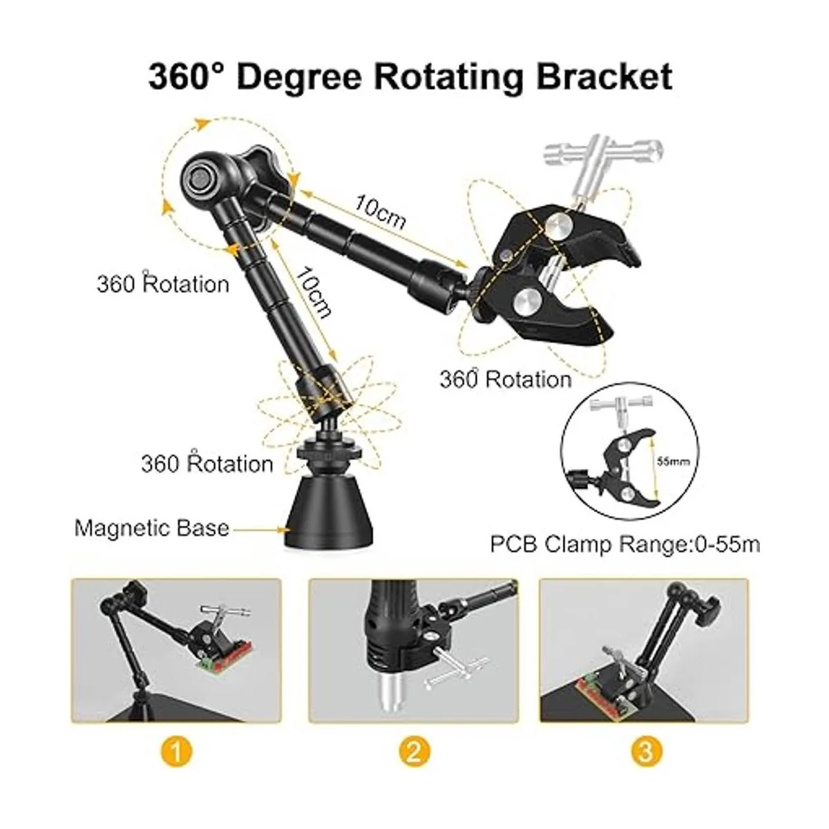 Marco de de aire caliente de rotación de 360 grados: tiene una base magnética fuerte, que se puede fijar en cualquier objeto de metal. Es fácil de trabajar. La parte del soporte se puede girar 360 grados, y la parte de la abrazadera se puede ajustar en ancho de acuerdo con los requisitos de trabajo. Es un buen ayudante para bricolaje.