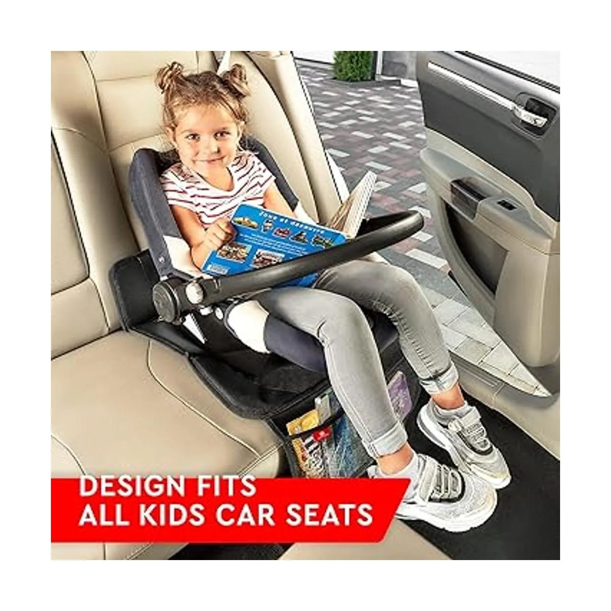 Multifuncional: la alfombrilla de coche es para debajo del asiento de coche de los niños. Alternativamente, el protector de asiento trasero del coche se puede utilizar para mascotas, perros y gatos como una funda de asiento para mascotas, alfombrilla de coche para perros o protector de asiento para gatos. El protector de alfombrilla es compatible con todo tipo de coches, camiones, furgonetas y SUV.