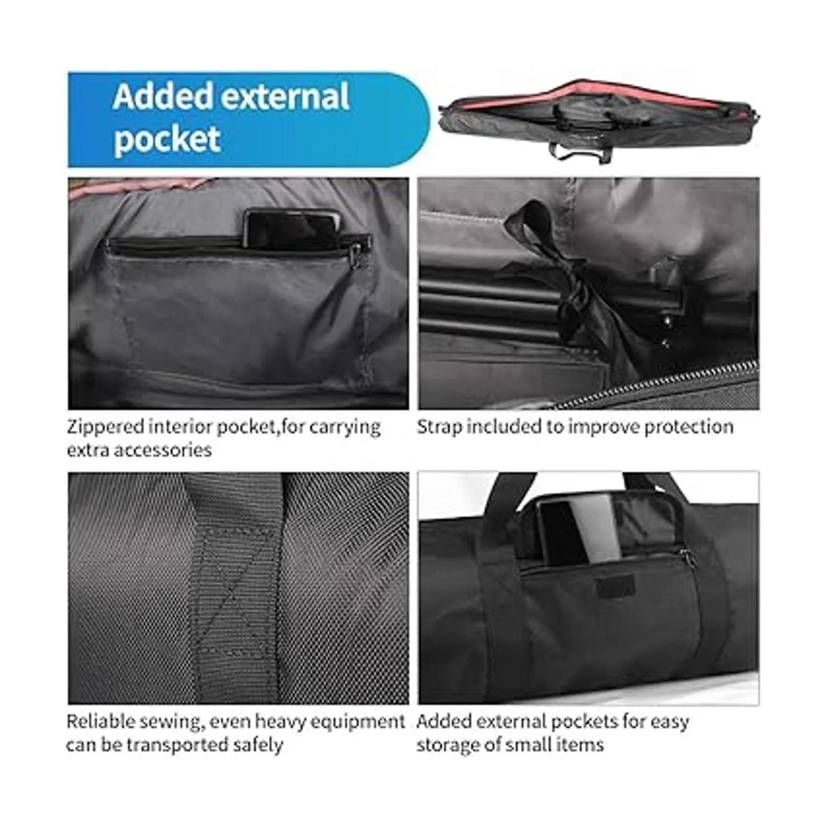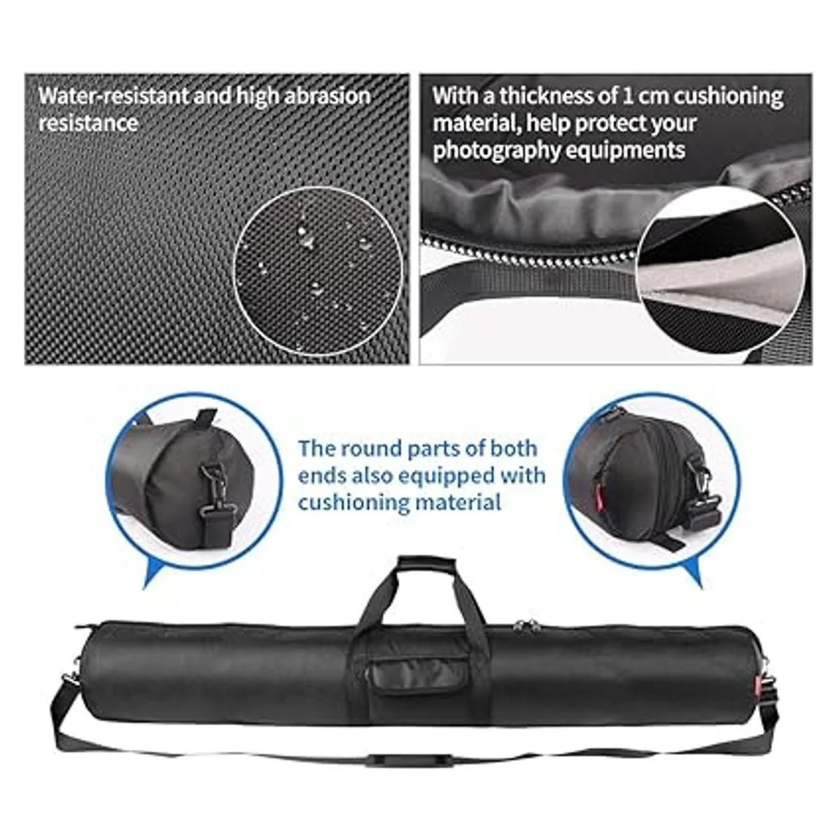 Alta calidad, resistente al agua, resistente a los impactos: hecho de material de nailon resistente y duradero, con excelente resistencia al agua y a la abrasión, que son duraderos y seguros en días lluviosos. Con material de amortiguación grueso, puede llevar de forma segura trípodes de cámara, instrumentos musicales, soportes de música, cañas de pescar, soportes de luz, etc.