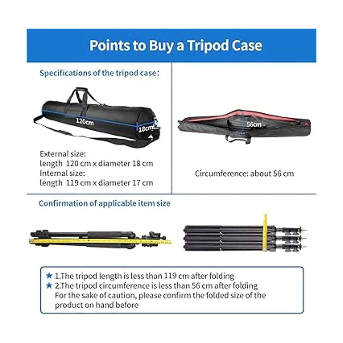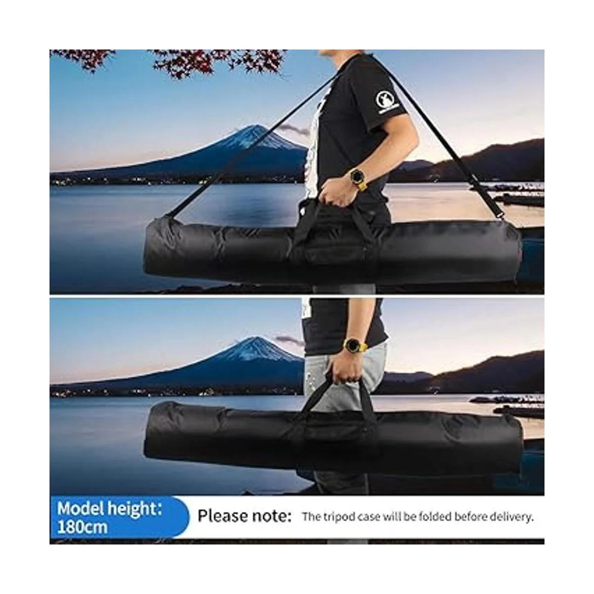 Fácil de transportar: la bolsa de trípode ligera se puede sostener a mano o colgar en el hombro, por lo que es conveniente para usar el transporte público. Dado que ambos extremos de la correa están fijos, se puede llevar de forma estable incluso en dirección vertical. Nota: que la bolsa del trípode se pliega antes de la entrega
