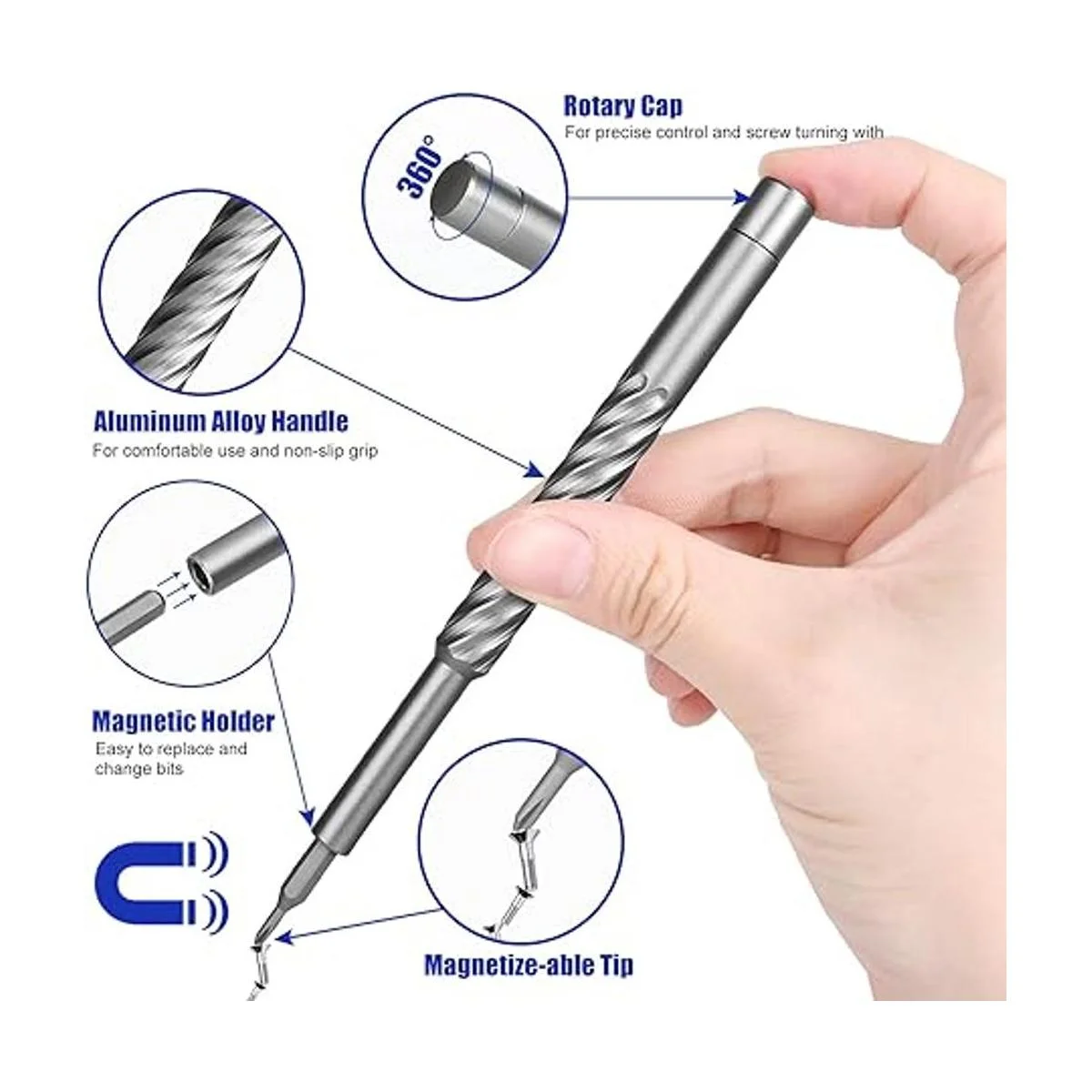 Mango ergonómico hecho de aleación de aluminio, imán integrado en la cabeza del mango, absorbe activamente las puntas de transmisión, tapa giratoria súper suave que te permite aplicar presión constante mientras giras. La herramienta desmagnetizadora magnética puede ajustar el magnetismo de las brocas, fuerte magnetismo para agarrar tornillos y débil para proteger la electrónica sensible. El eje de extensión flexible ayuda a alcanzar posiciones estrechas. y los diversos accesorios del kit hacen que tu trabajo de reparación sea más fácil y eficiente