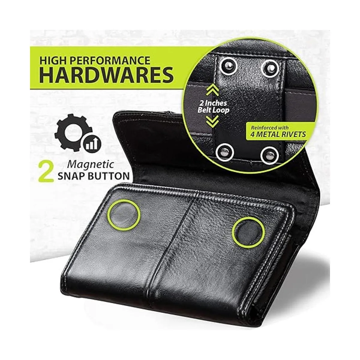 Hardware: construido con fuerte cierre magnético tapa cerrada en cuero para garantizar la seguridad del teléfono. La trabilla para cinturón está reforzada con remaches de acero para un apoyo adicional para resistir el desgarro. El diseño elegante y minimalista le da a este bolso un aspecto inteligente atemporal.