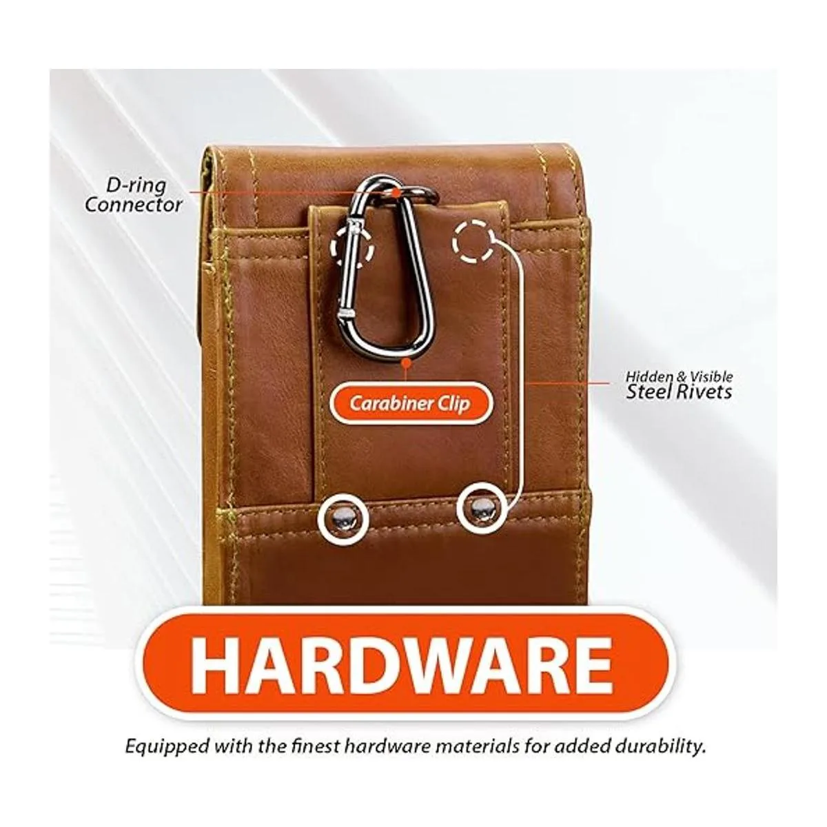 Materiales bien hechos: la funda para teléfono celular está equipada con los mejores materiales de hardware para mayor durabilidad. Cuatro remaches soportan la trabilla del cinturón sin dificultad y también tiene un mosquetón de anillo en D instalado en la parte posterior de la funda del cinturón para mantenerlo en su lugar de forma segura.