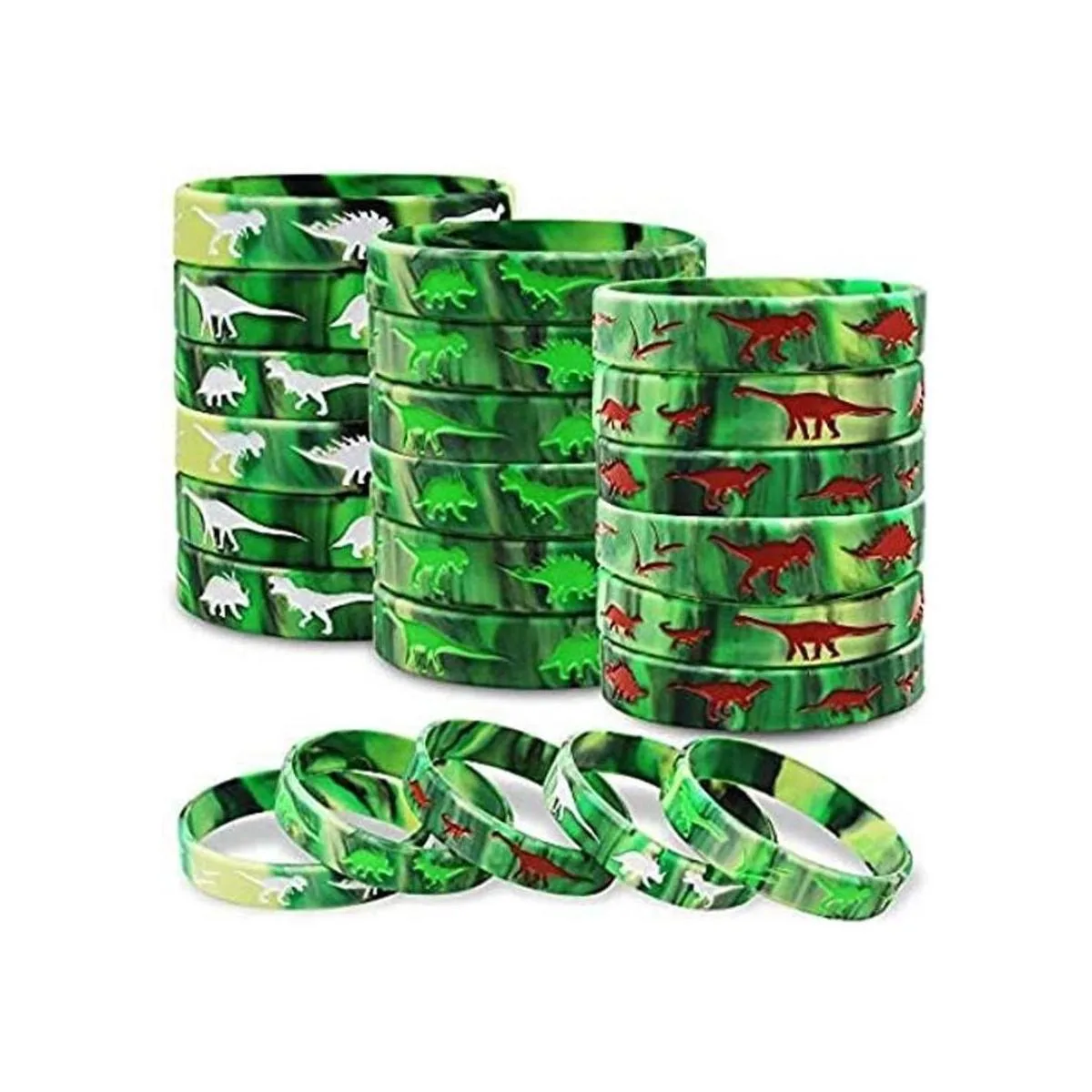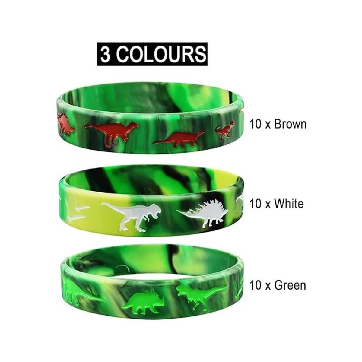 Gran cantidad: viene con 30 pulseras de goma de dinosaurios en 3 colores. Verde, marrón y blanco. Paquete de 10 unidades por cada color. Diseño simple y colorido, que es popular entre los niños.