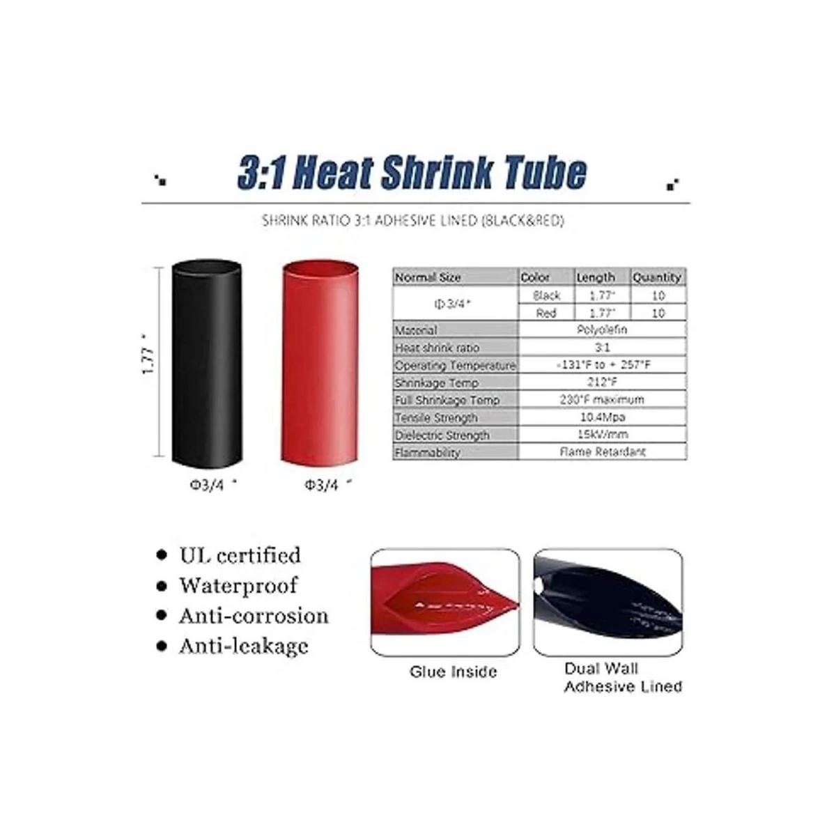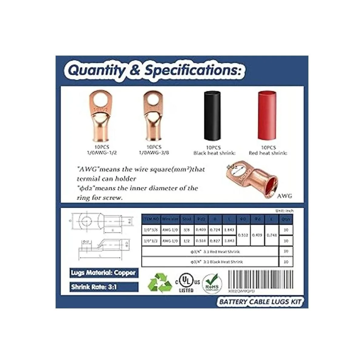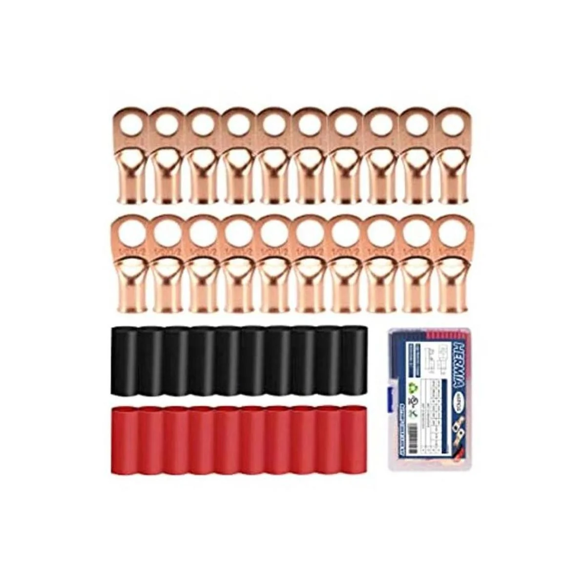 Kits de extremos de cable de batería: 10 lengetas de alambre de cobre de 1/0 AWG1/2 pulgada y 10 lengetas de alambre de cobre de 1/0 AWG3/8 pulgadas, 20 tubos termorretráctiles 3:1 10 negros y 10 rojos, 1 caja de almacenamiento de plástico