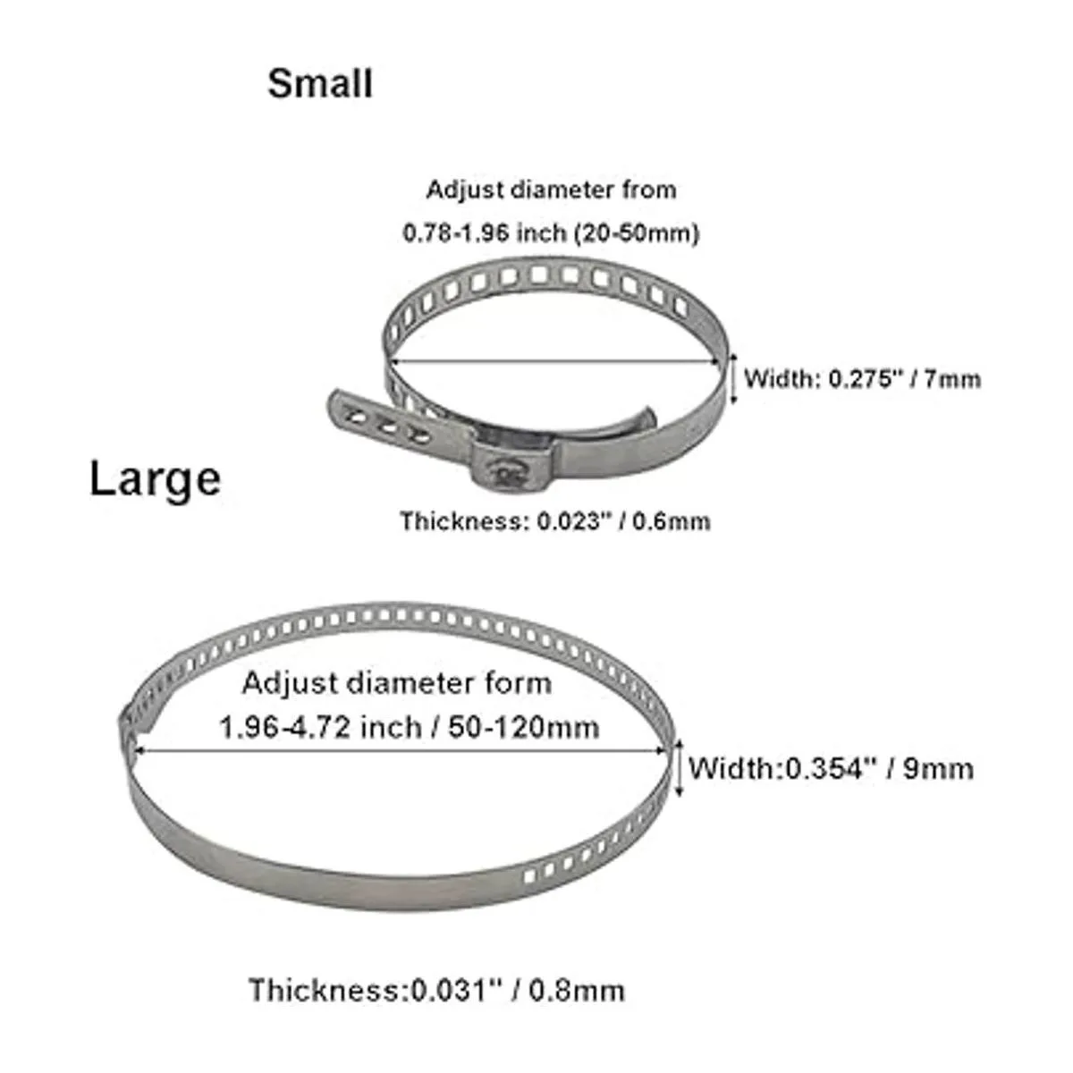 El tamaño de la abrazadera de oreja es ajustable: pequeño: ajusta el diámetro de 20 a 1.969 in, 0.276 in de ancho y 0.024 in de grosor, diámetro de ajuste grande de 50 a 4.724 in, 0.354 in de ancho y 0.000 in 31 pulgadas 031 0.031 in de grosor.