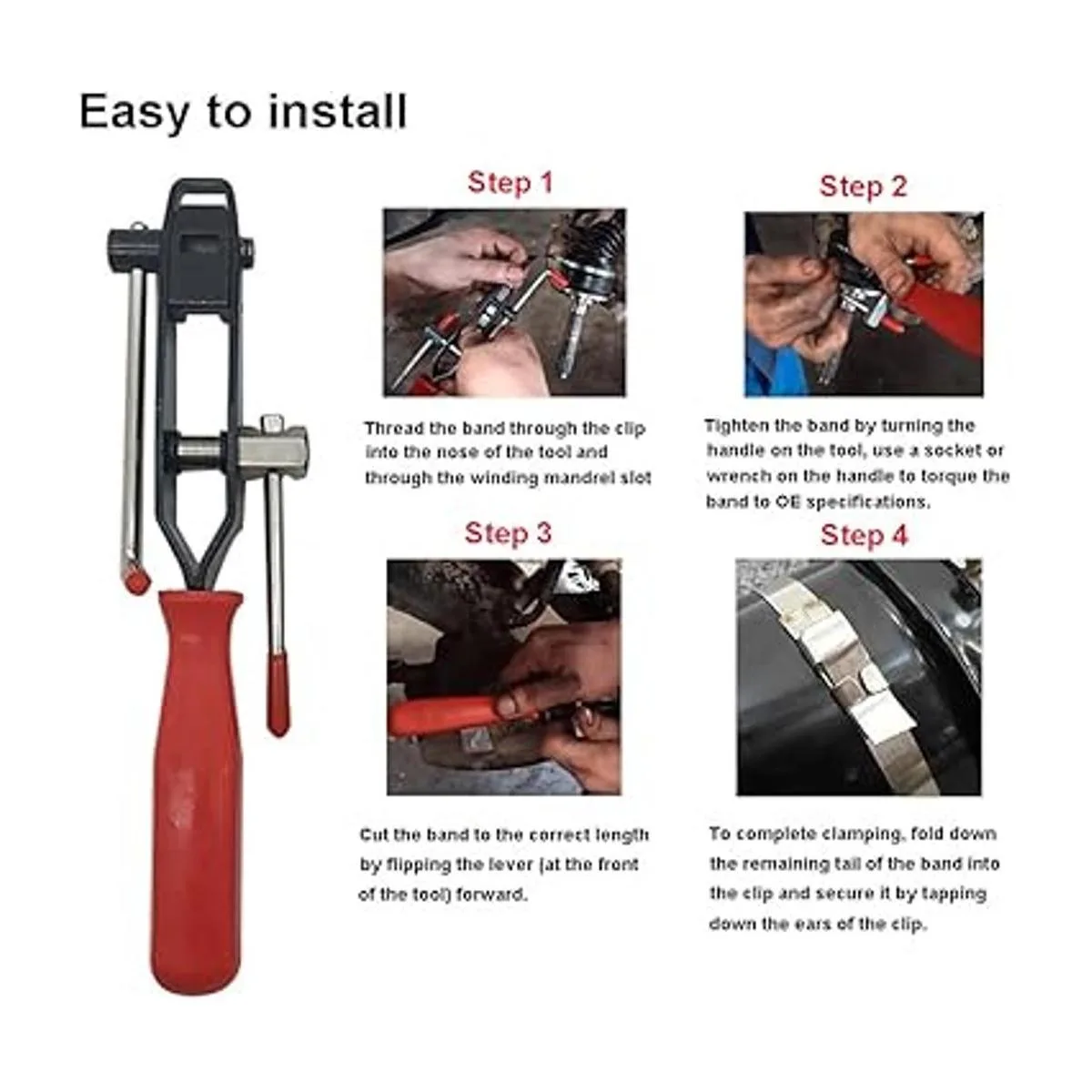Herramienta de banda de abrazadera de junta CV: hecha de acero de alta calidad, uso con correas de banda de hasta 0.394 in de ancho, 0.024 in de grosor, con un cortador integrado y mecanismo de bobinado, la banda se puede apretar y cortar rápida y eficazmente. Nota: las correas de banda no están incluidas, solo se incluyen las abrazaderas de crimpado de oreja que se muestran en la imagen