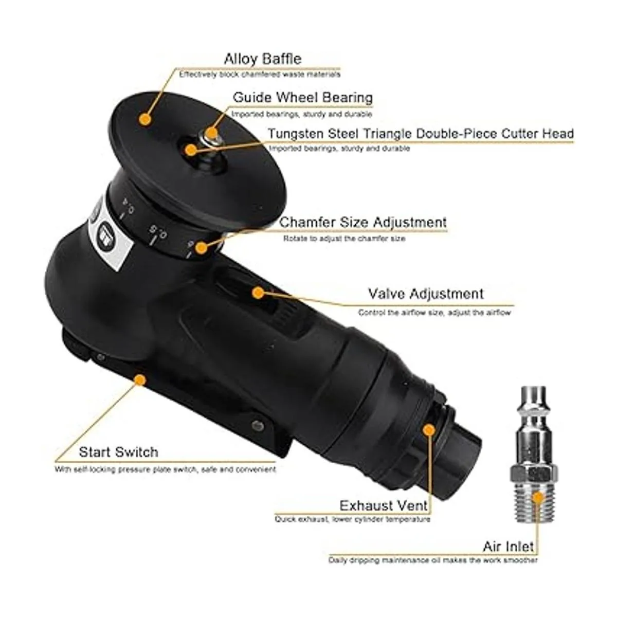Mayor eficiencia de corte: la versión mejorada de la herramienta de chaflán neumático, el nuevo diseño adopta una nueva carcasa con rodamientos de alta calidad, y está equipado con cuchillas reemplazables de acero de tungsteno de alta precisión tratadas térmicamente para un mejor uso y un desbarbado y biselado más suaves.