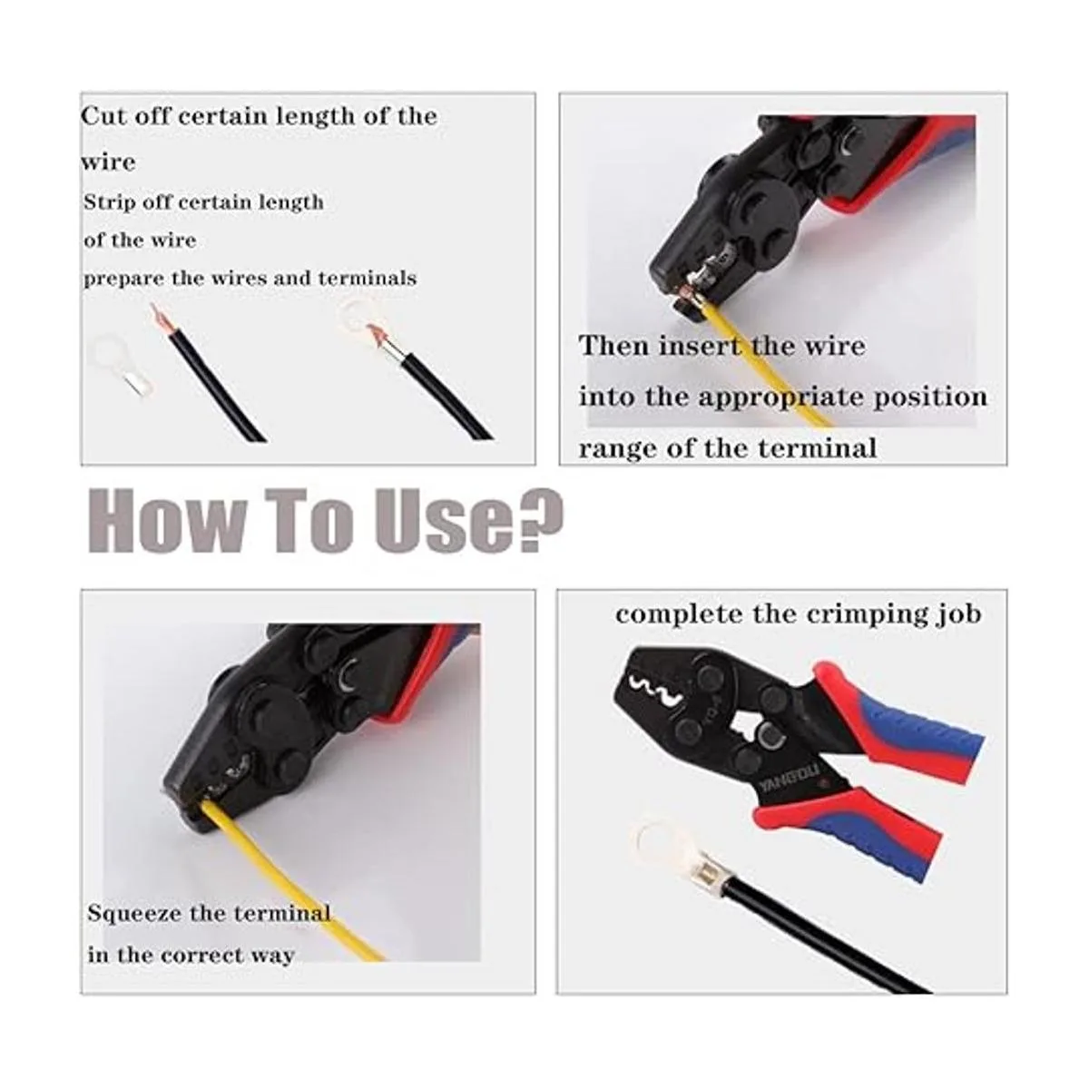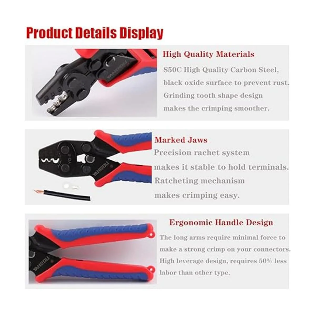 Alta eficiencia: el sistema de trinquete de precisión hace que sea estable sostener terminales. Los agarres de elastómero se ajustan cómodamente a la mano. Troqueles duraderos hechos de acero al cromo molibdeno