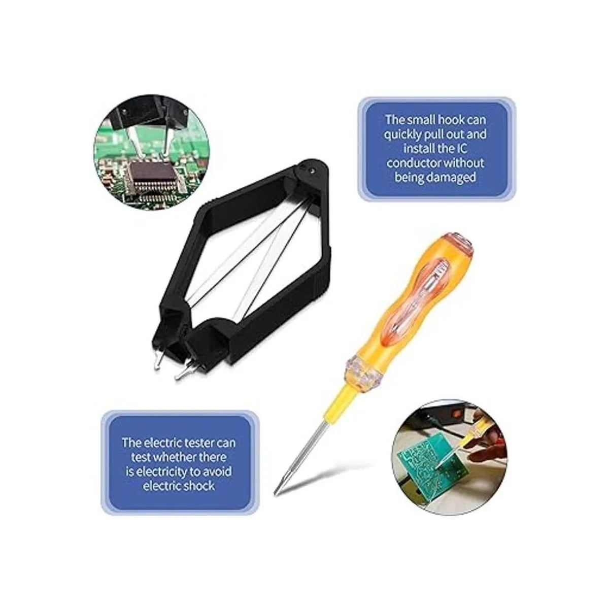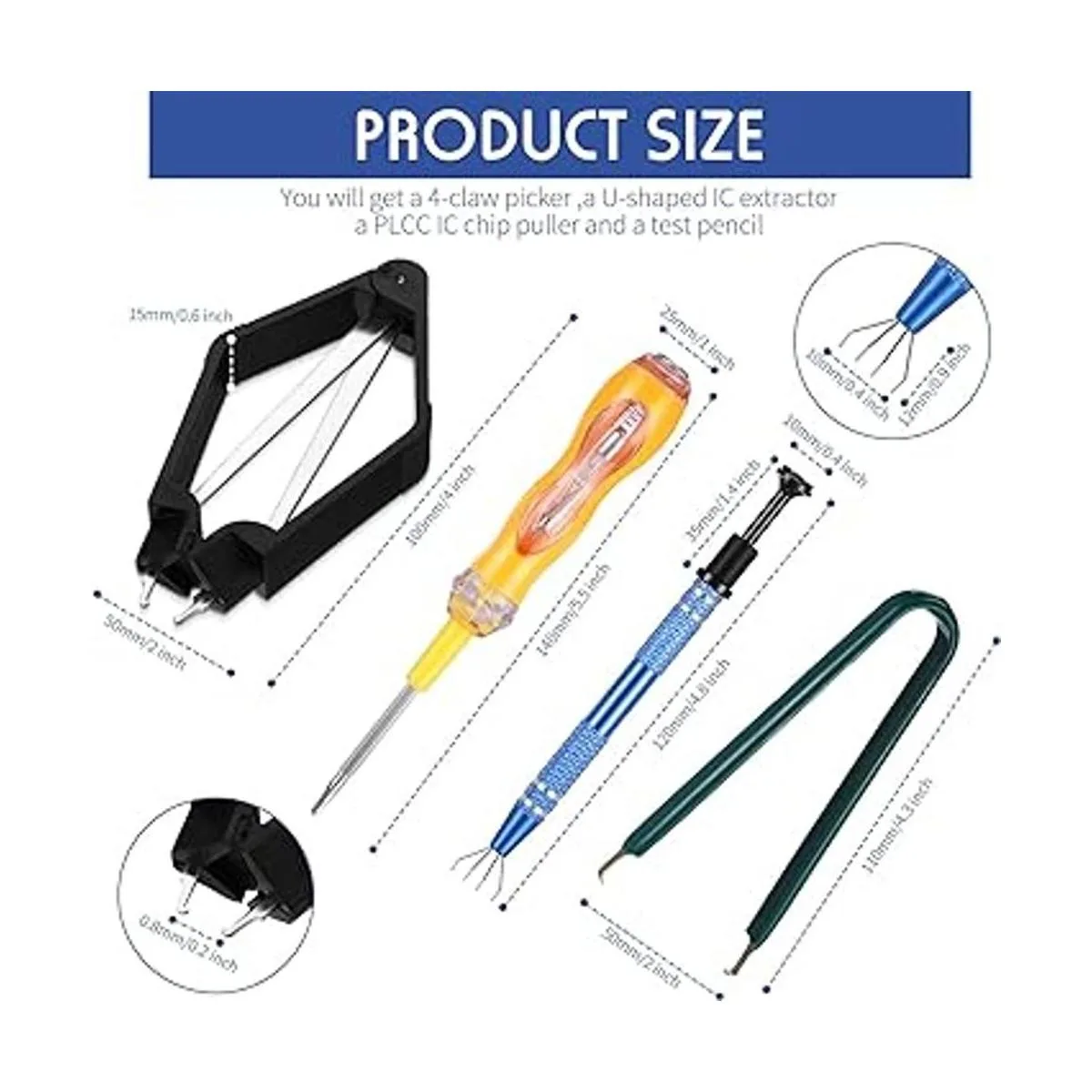 Tamaño universal: el peso total de las 4 herramientas es de aproximadamente 3.53 oz. El extractor de 4 garras mide 4.7 x 0.4 in. Extractor en forma de U mide aproximadamente 4.3 x 2.0 in. Extractor de chips PLCC IC de 3.9 x 2.0 x 0.6 in. Lápiz de prueba, cada tamaño 1 1.6 x 1.0 in.