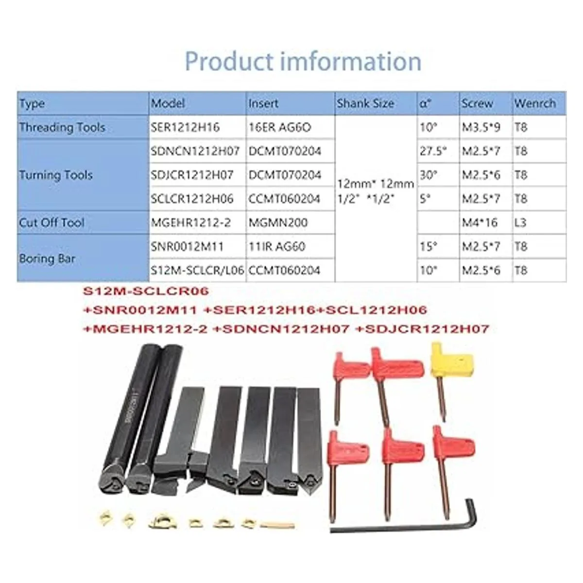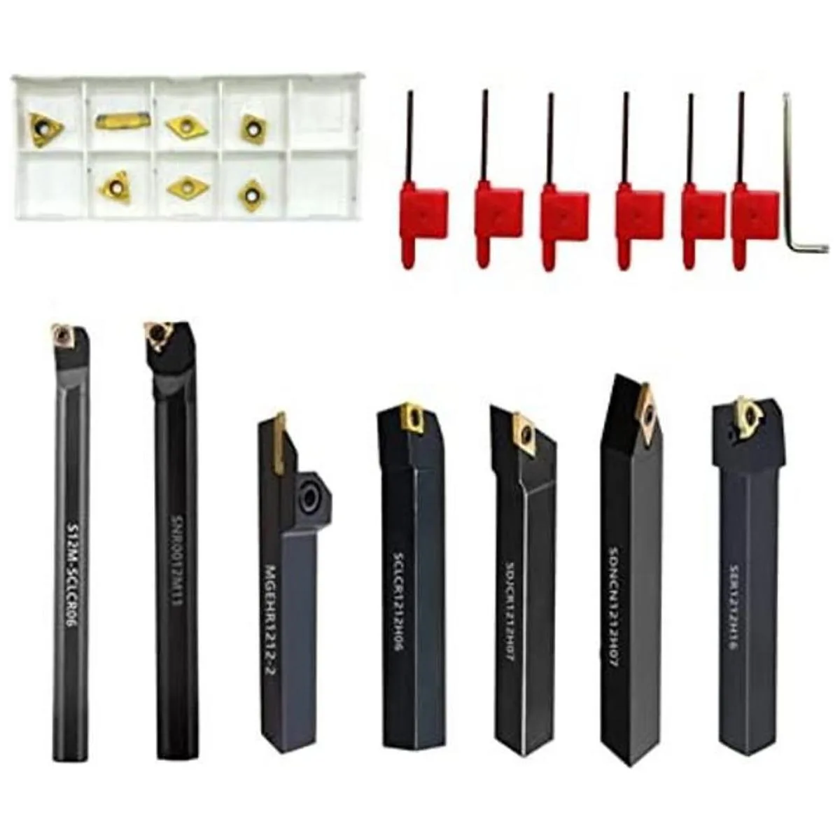 Herramientas de giro multifuncionales: 7 barras de mandrinar S12MSCLCR06/SER1212H16/SCL1212H06/MGEHR12122/SNR0012M11/SDNCN1212H07/SDJCR1212H07 7 llaves 7 insertos de carburo