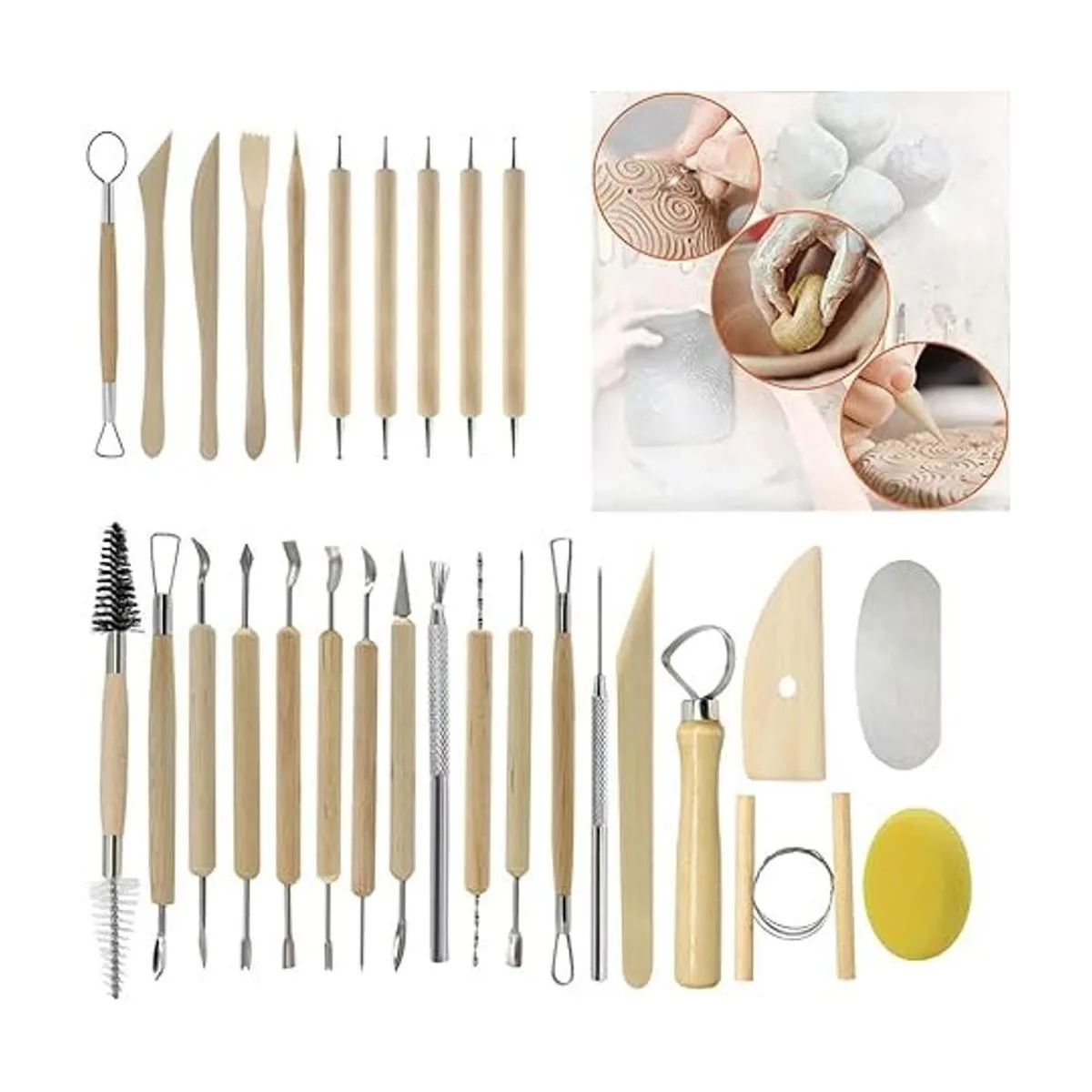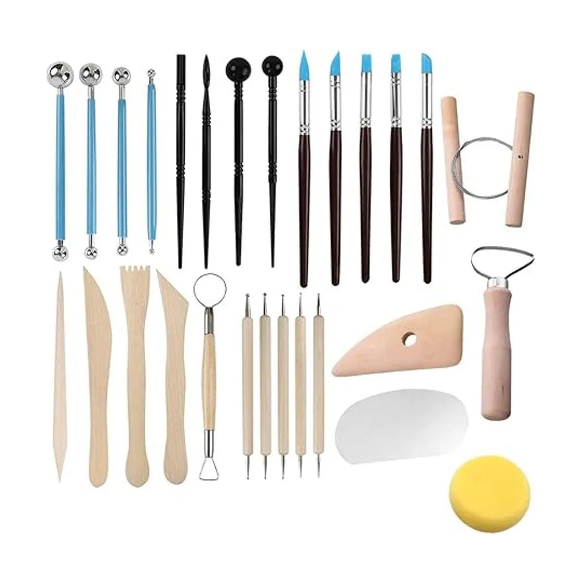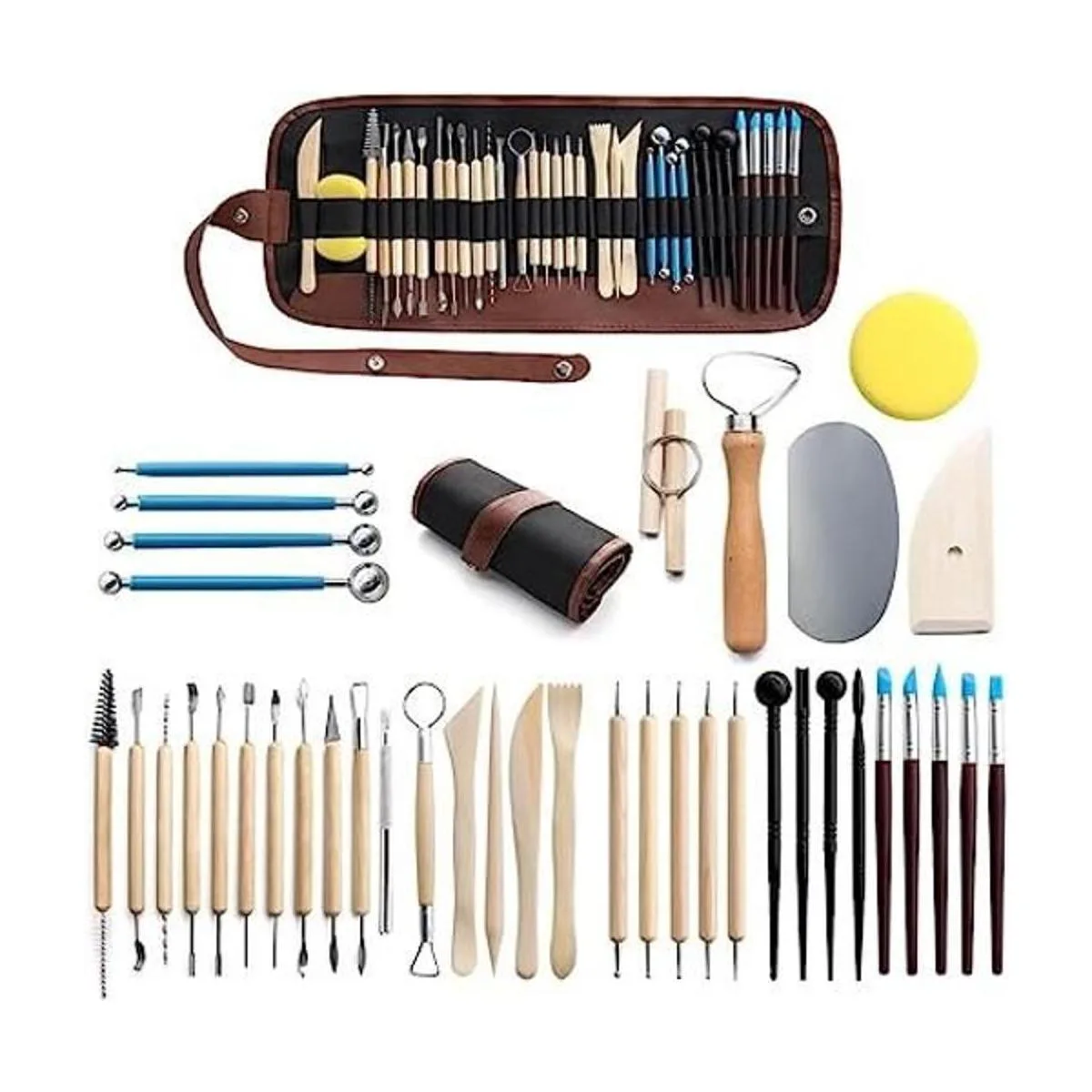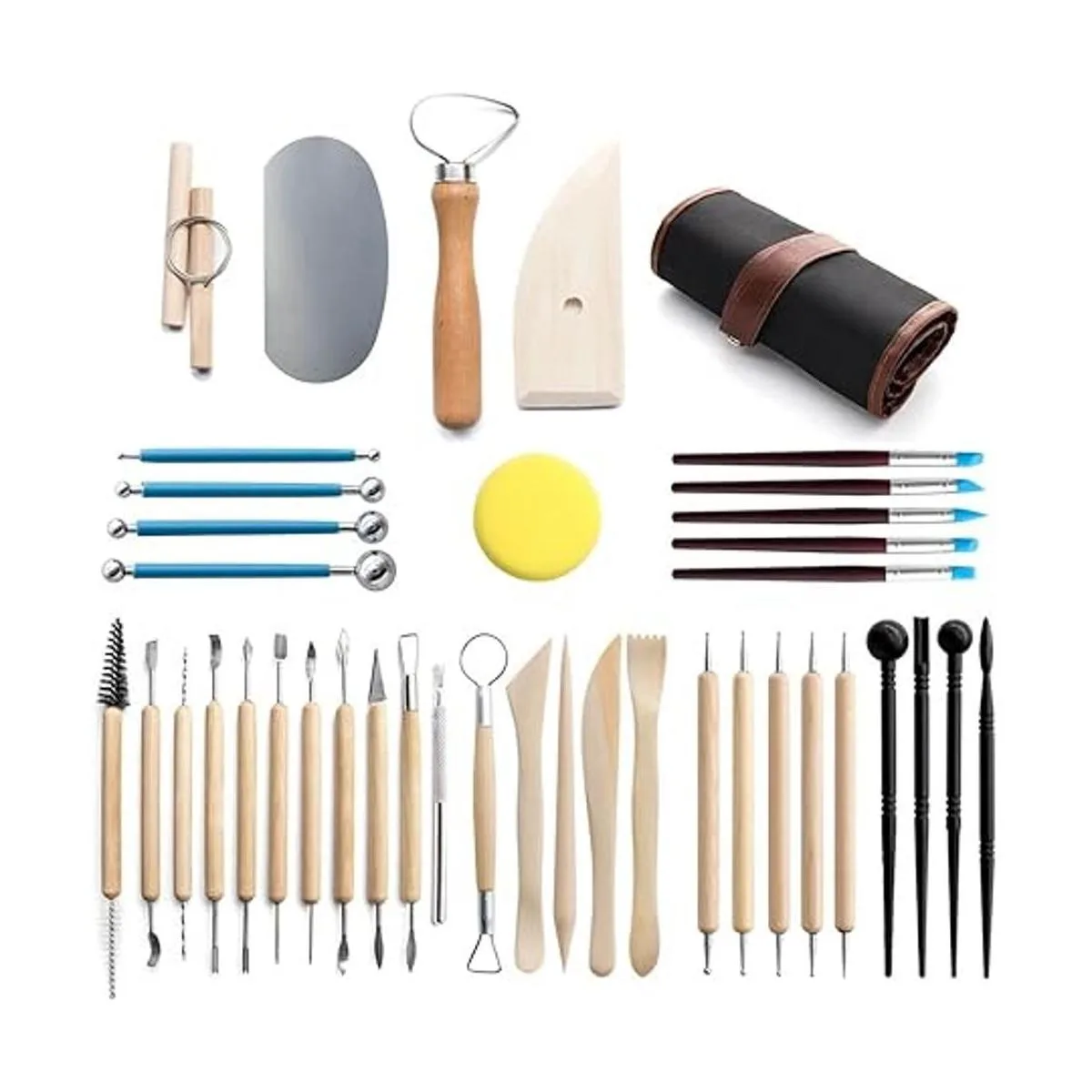 Juego de 40 herramientas de arcilla: 11 herramientas de doble cara, 9 herramientas de arcilla de cerámica, 5 lápices de bola de mango de madera, 5 bolígrafos de goma, 4 lápices de bola de mango de goma, 4 lápices de plástico, 1 esponja de cerámica, 1 bolsa de transporte.