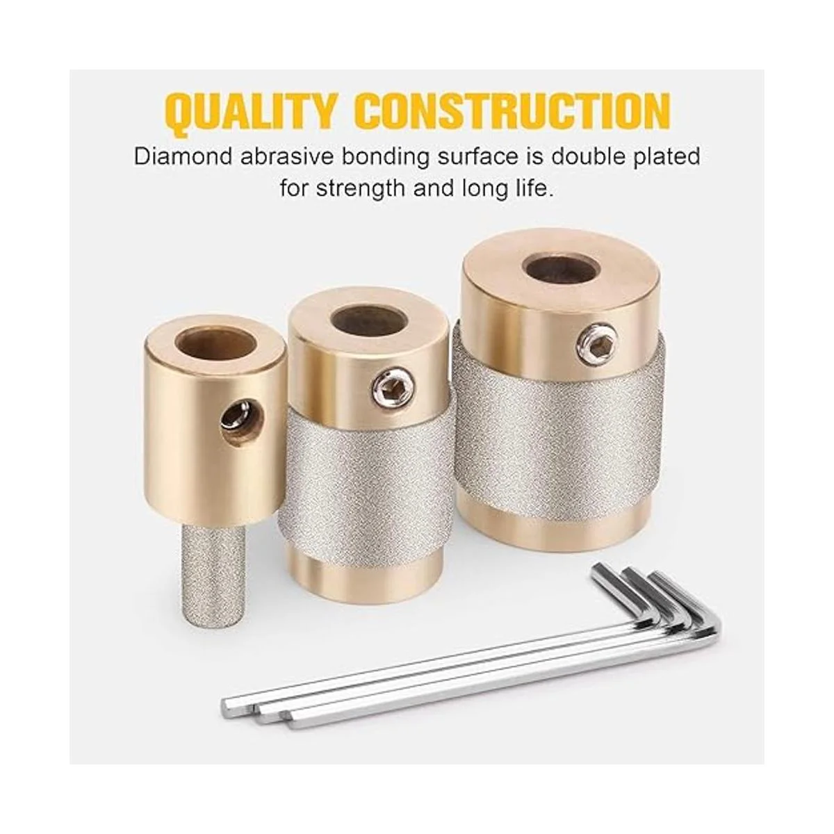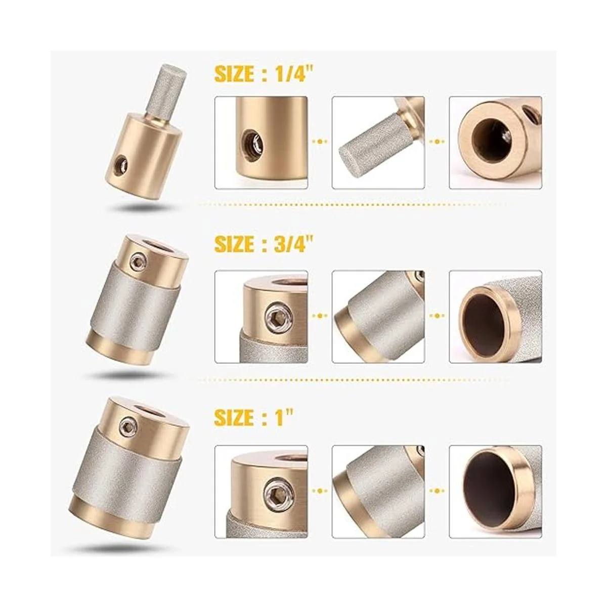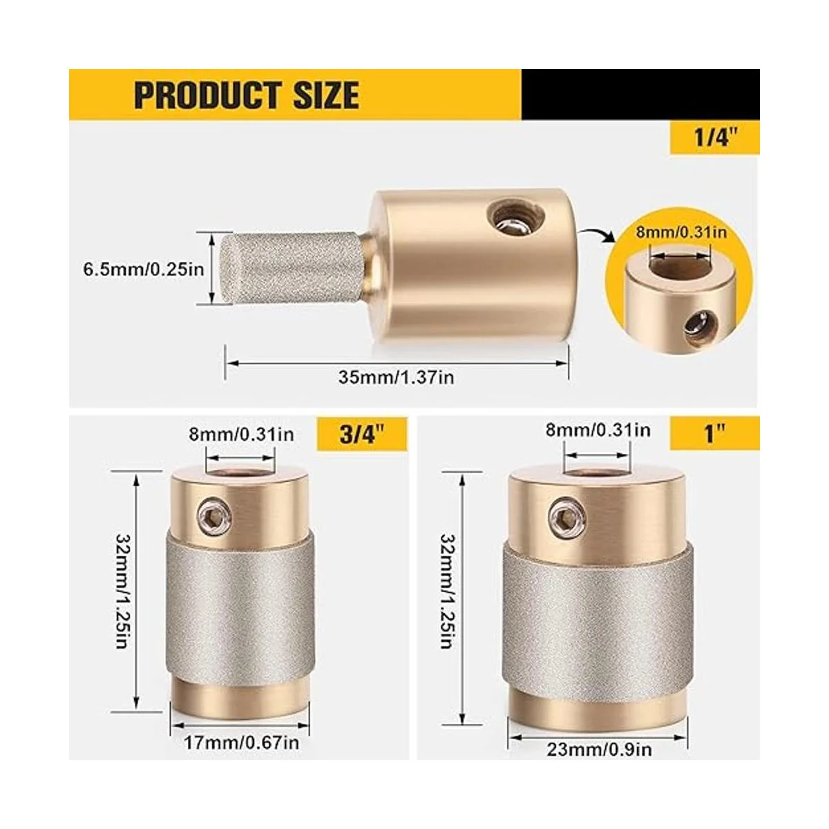 La broca está cromada y endurecida tiene 3 piezas de brocas de molienda de diamante en 3 tamaños, es decir, 1 pulgada, 3/4 pulgadas, 1/4 pulgadas, junto con 3 llaves Allen a juego, diferentes tamaños y combinación completa para satisfacer completamente tu uso de bricolaje