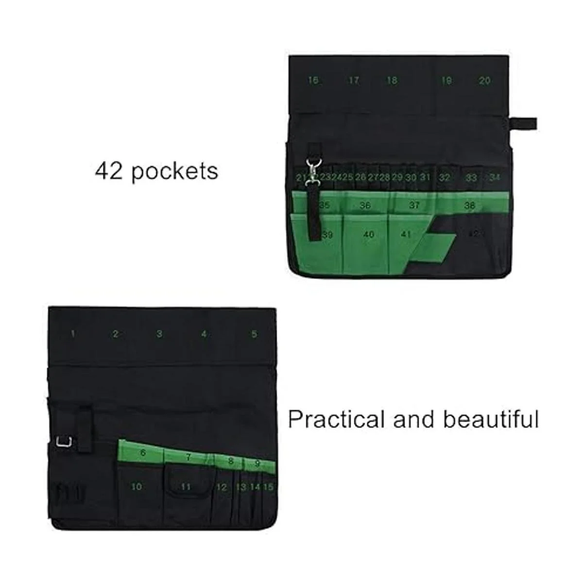 La bolsa de herramientas de jardín es de 11.5 x 18.0 in, pesa 1.1 lbs. 42 bolsillos de almacenamiento para guardar más herramientas, fácil de quitar y limpiar.