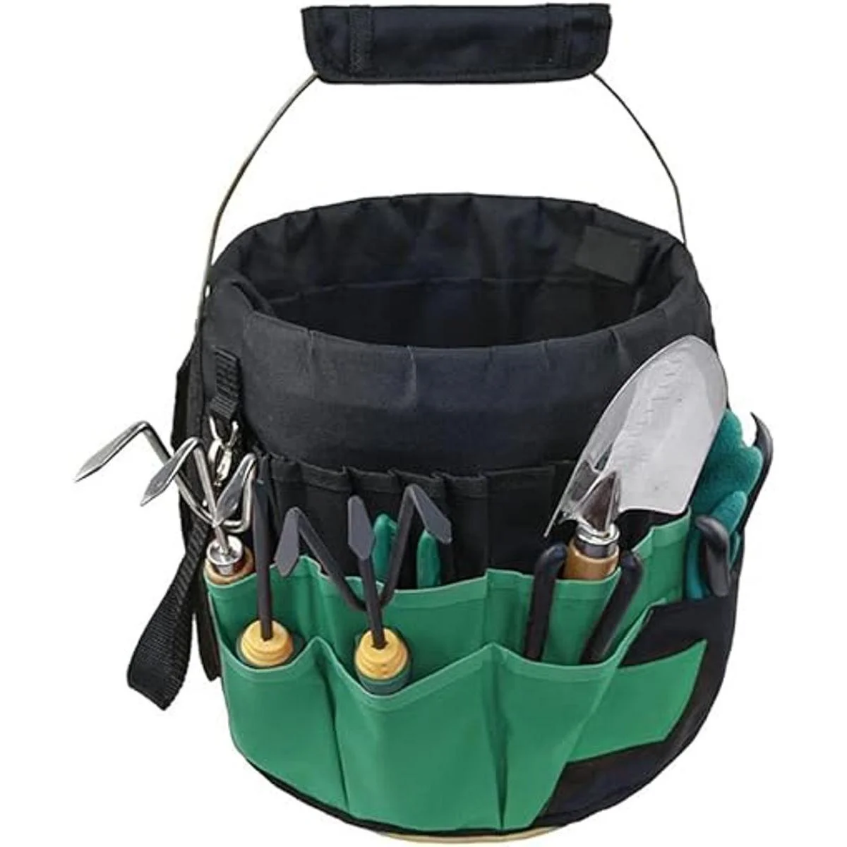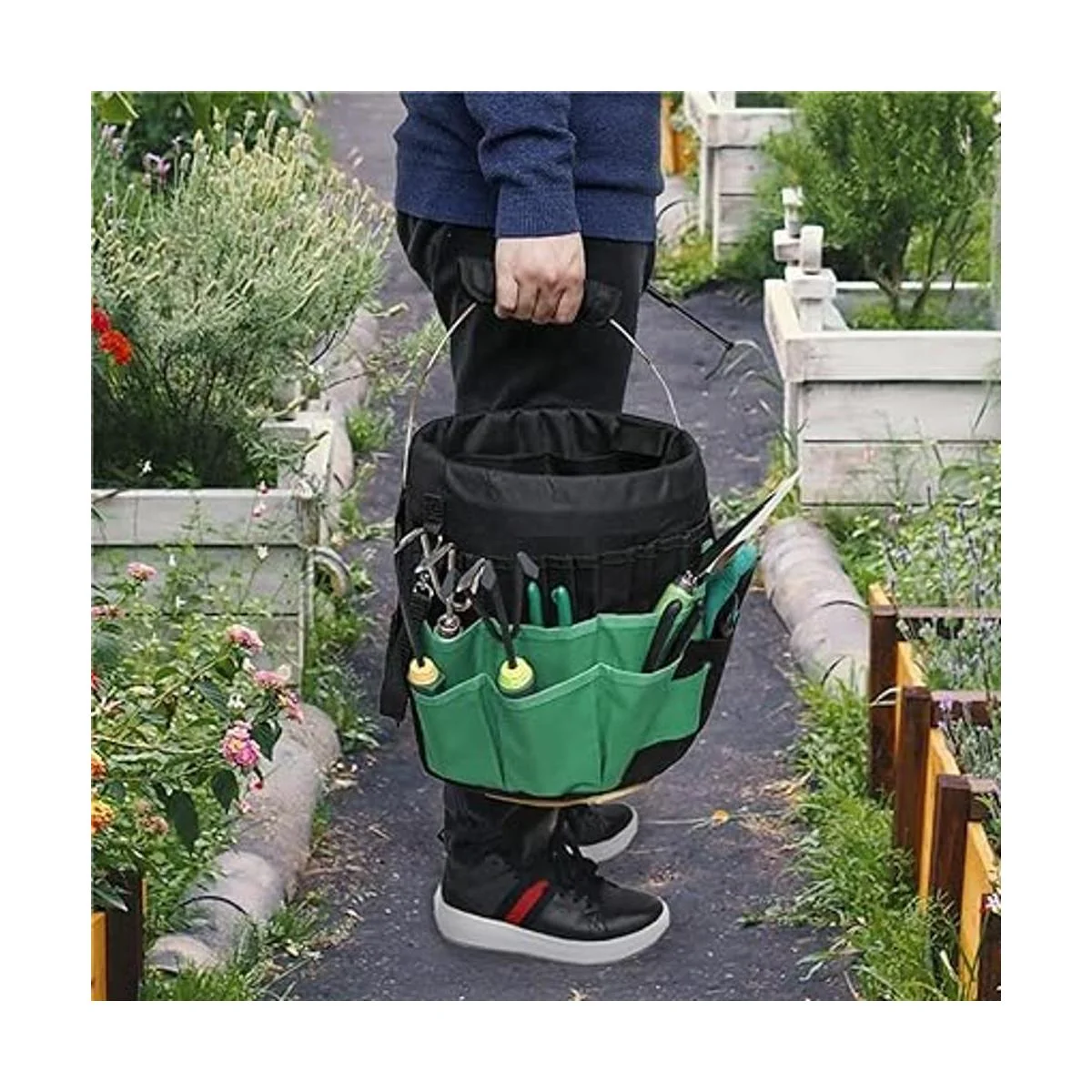 Puedes colocar tu cubo de agua dentro de la bolsa de herramientas de jardinería como se muestra en la imagen, que será un soporte organizador de jardinería por sí mismo.