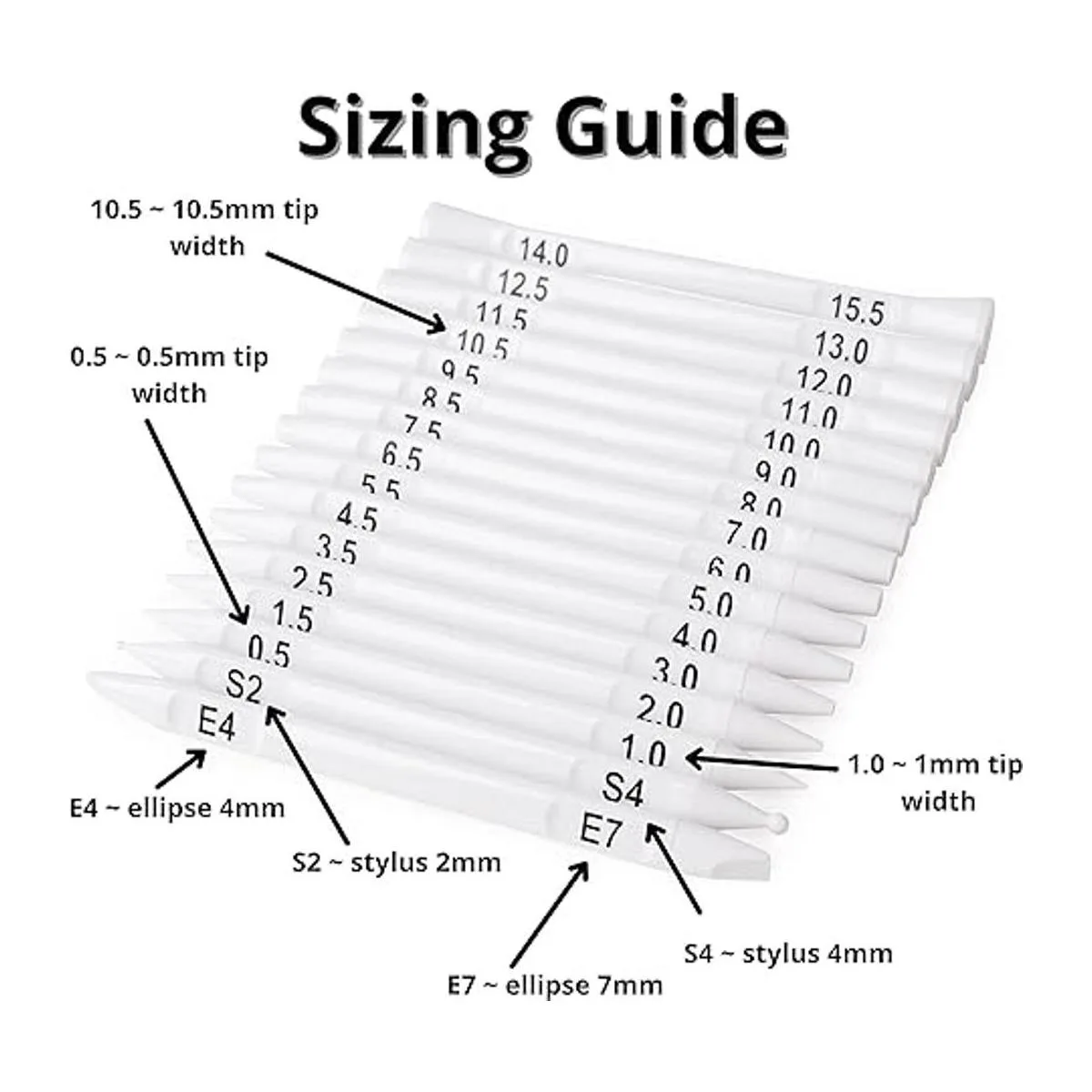 16 herramientas de arte de punto de doble extremo que varían de 0.020 in a 0.591 in, además de una herramienta elipse única y lápiz capacitivo para opciones más creativas. Pendiente de patente
