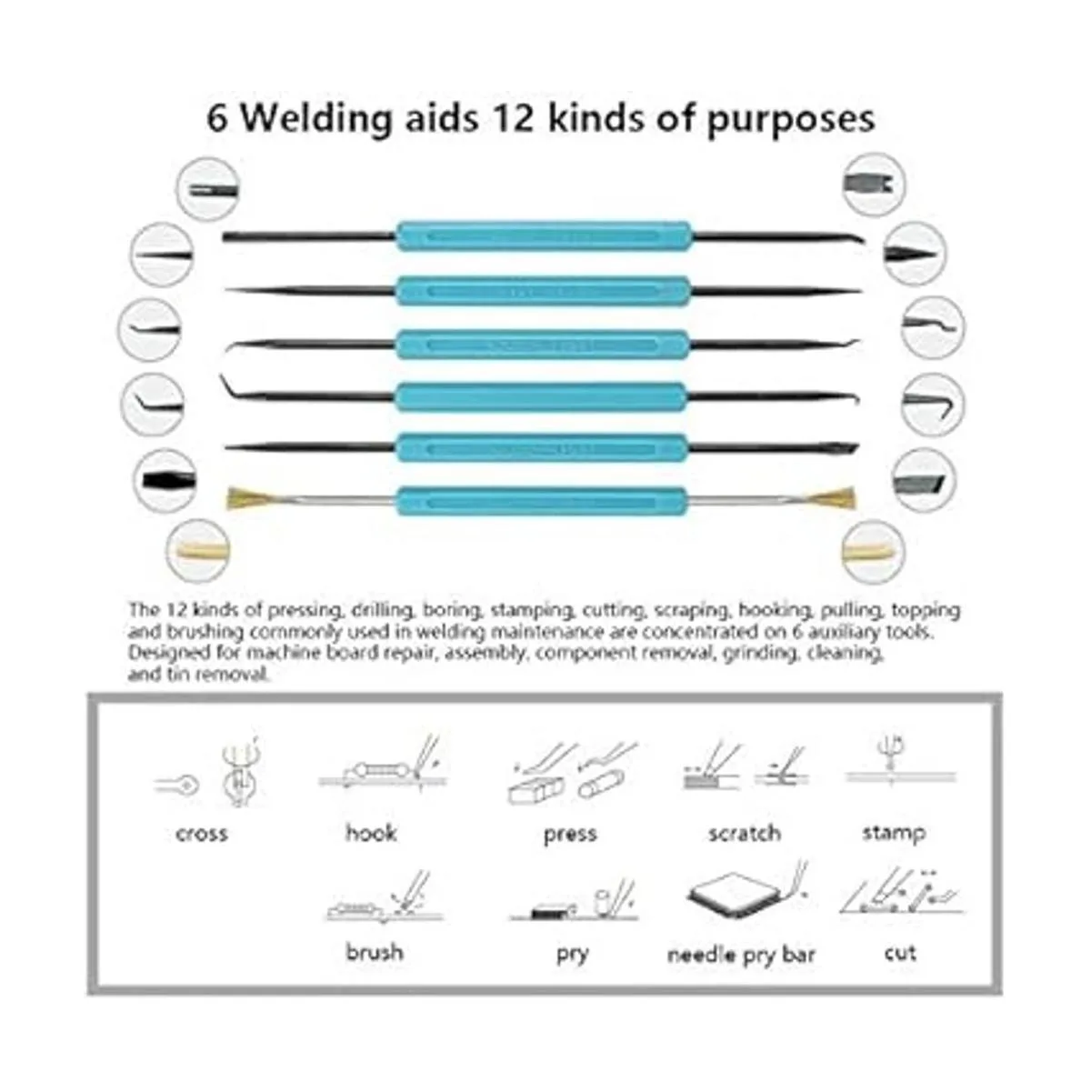 Herramientas auxiliares de soldadura: ampliamente utilizado en reparación electrónica, soldadura, desoldadura, etc. Puede utilizar cortes, raspado, ganchos, cepillos y otros requisitos de soldadura. Alicates de corte: hecho de acero de alta calidad, puede cortar con precisión cables flexibles dentro de 0.039 in. Pinzas ESD antiestáticas: hechas de acero inoxidable de alta calidad, antiestáticas, antiadherentes.