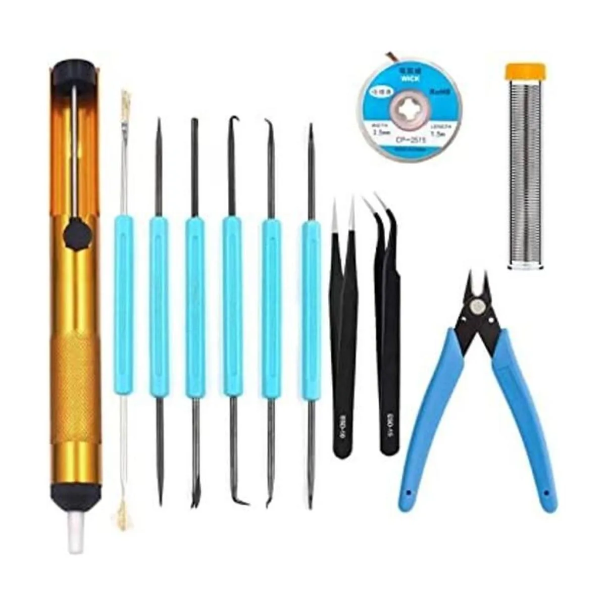 Kit de herramientas: incluye 6 herramientas de soldadura y bomba de desoldado, núcleo desoldador, cortadores de alambre, pinzas ESD antiestáticas, alambre de soldadura de 0.031 in.