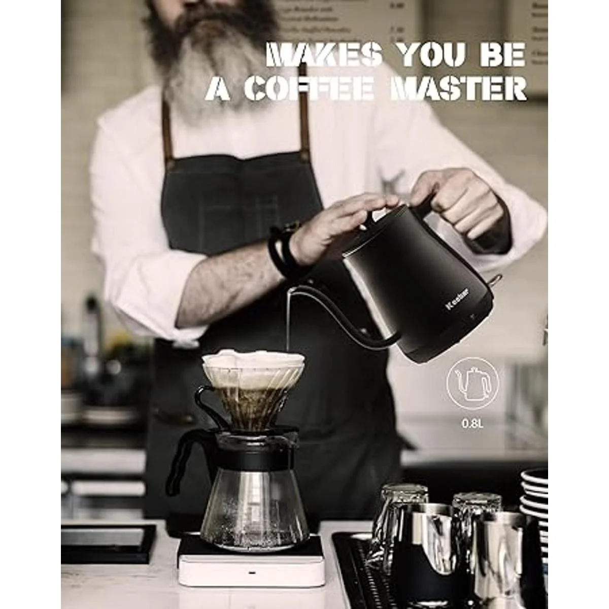 Vertido preciso: vertido preciso y diseño a prueba de fugas que evita cualquier fuga al verter. El hervidor eléctrico tiene una boquilla larga de cuello de cisne, boquilla de vertido de precisión de 0.031 in que permite que el agua fluya de forma constante lenta, sensible y predecible para garantizar el mejor sabor cuando se vierte sobre café o té. Una construcción corporal equilibrada y un mango resistente al calor fomentan un tiempo de vertido más cómodo y más largo. Lo mejor para preparar café y té.