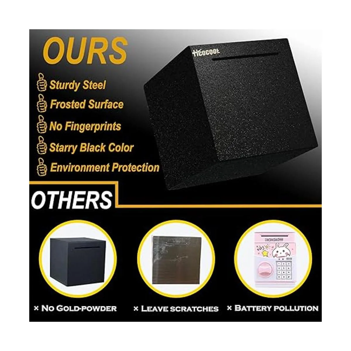 UNIQUE STARRY BLACK Our black piggy bank adopts an electrostatic spraying process, the surface is shown in a frosted black color with gold foil powder. Unlike normal stainless steel banks, ours does not reflect light and can also hide fingerprints, especially under the light source will show a shiny starry black color. It is a unique steel bank in the market and your first choice of novelty money bank in 2022