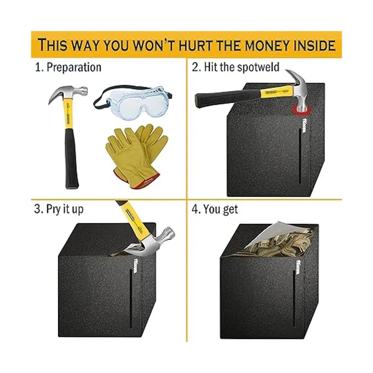 SAVING FOR A RAINY DAY This ONLY IN NO OUT piggy bank has sealed 6 sides and only 1 slot. Youll need a hammer, handsaw, and other tools to open it. So please open it only when youve achieved your goal, or in emergencies. PLEASE REMEMBER, To this adult piggy bank, OPEN EQUAL TO DESTROY. Ideal for longterm saving plans