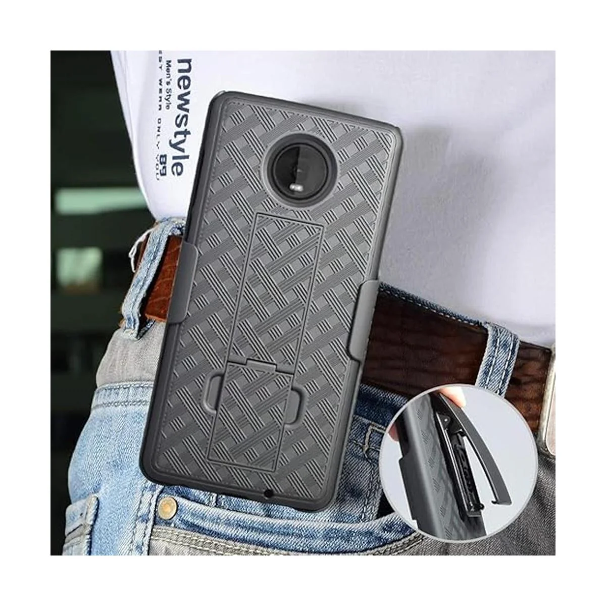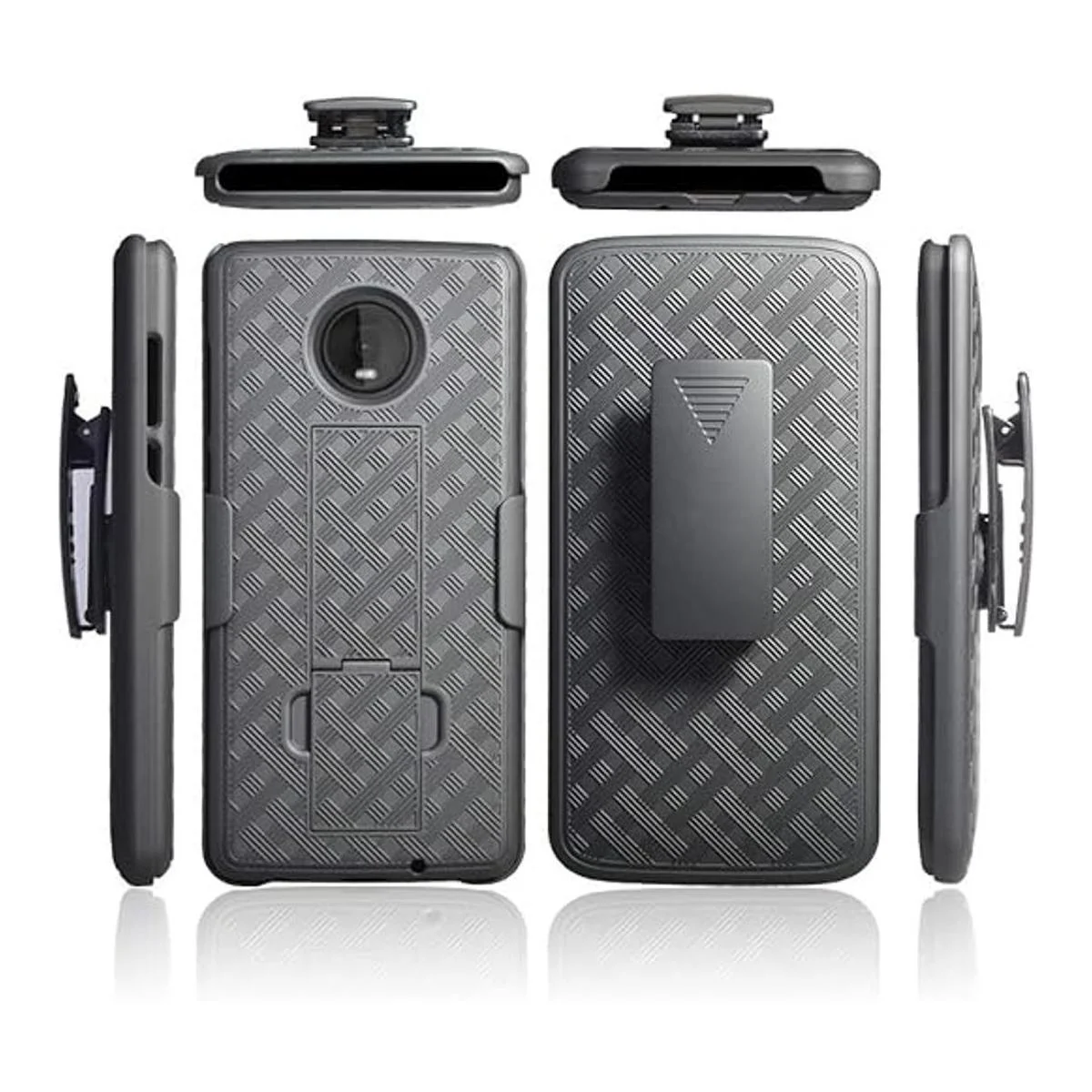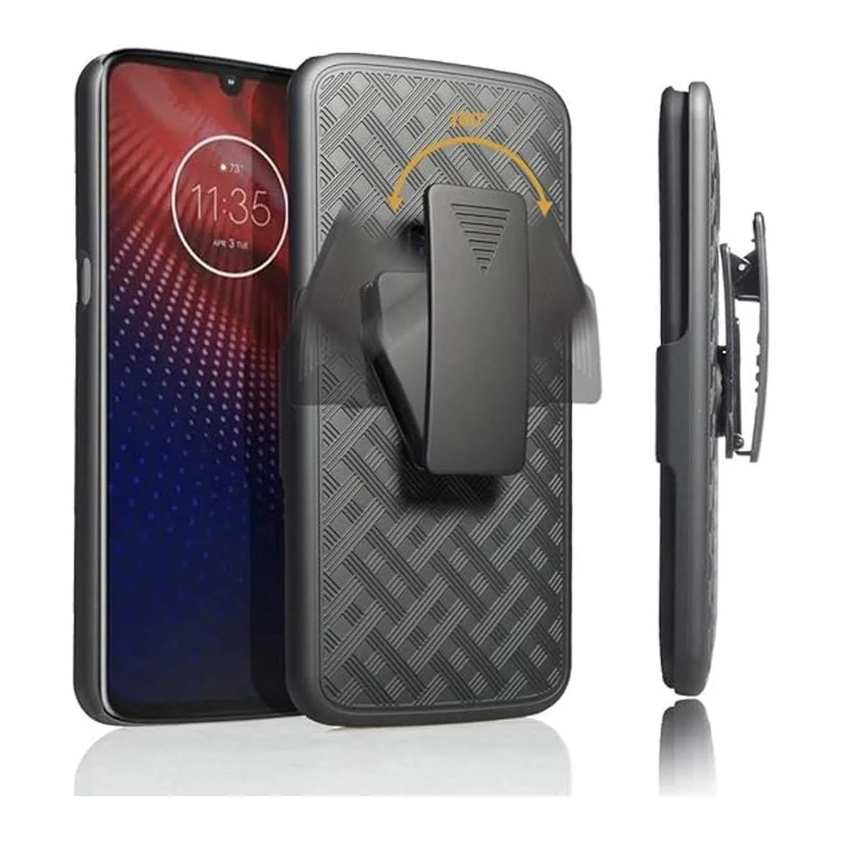 Moto Z4 Play funda híbrida delgada, delgada y de perfil bajo con soporte integrado y clip de sujeción de plástico rígido, no añade volumen a tu teléfono, fácil de poner y quitar, tacto de goma para un agarre antideslizante. Se puede quitar fácilmente de la funda sin quitar la carcasa trasera.