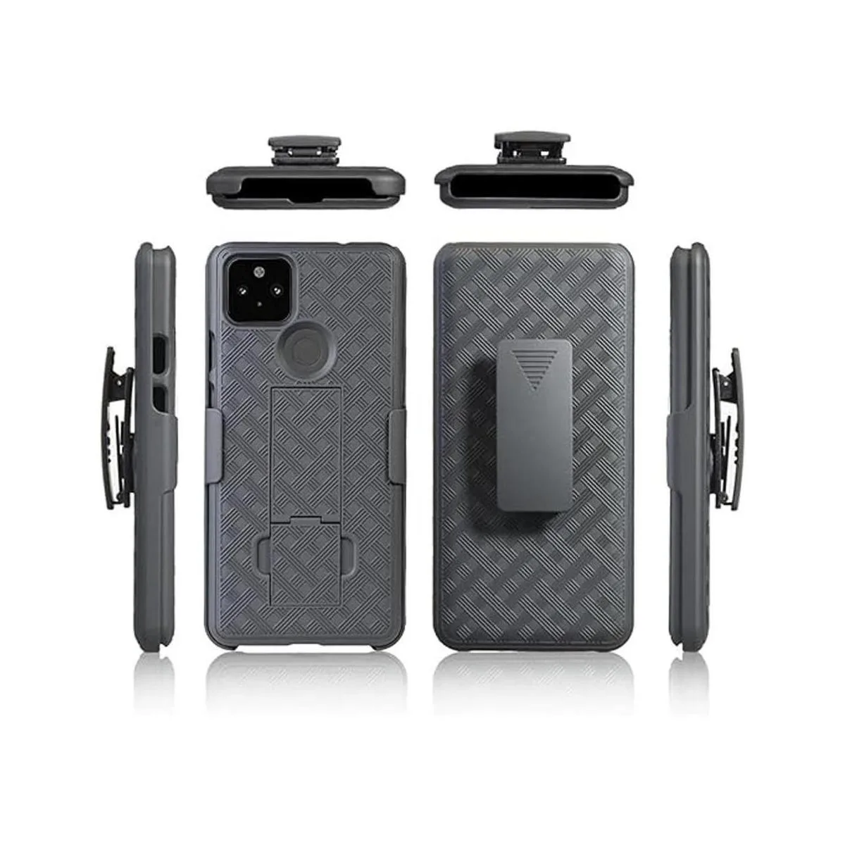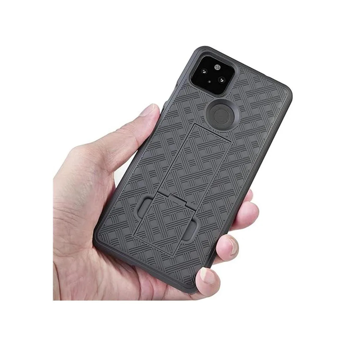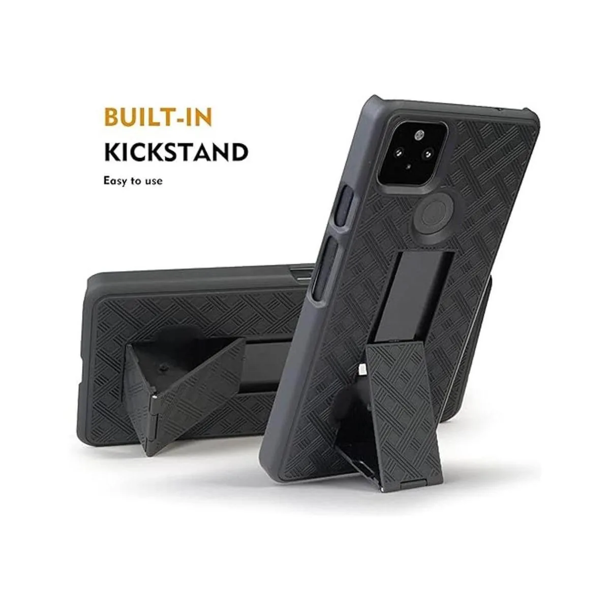 Google Pixel 5A Hybrid Combo Case: delgado perfil bajo con soporte integrado y clip de pistolera hecho de plástico rígido, tacto de goma para un agarre antideslizante. Se puede quitar fácilmente de la funda sin quitar la carcasa trasera.