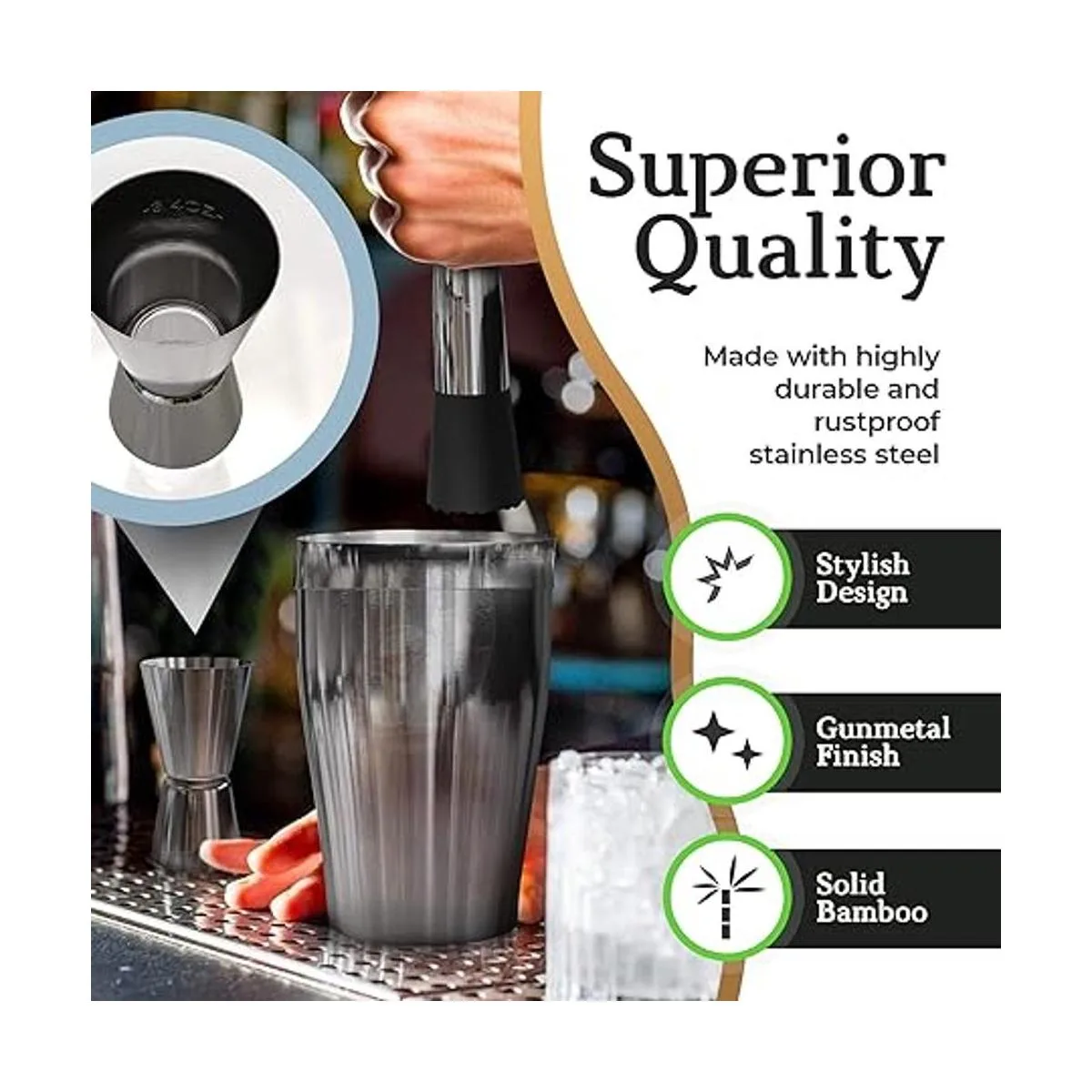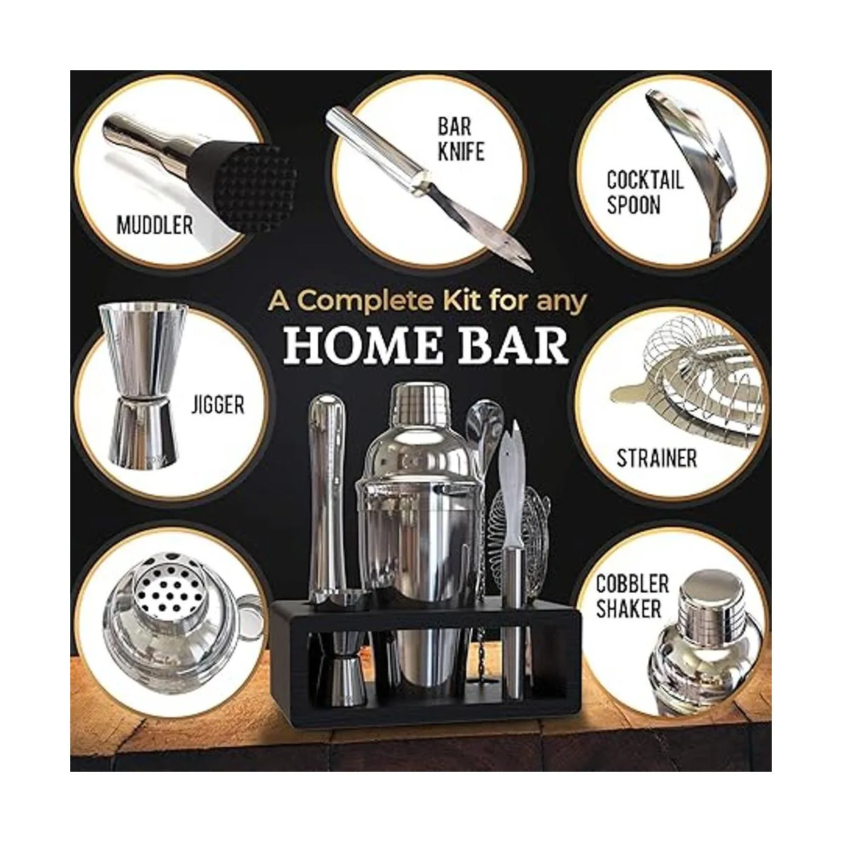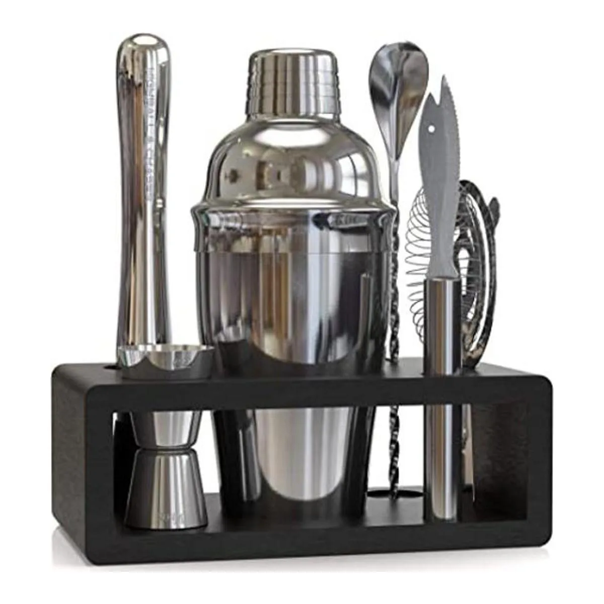 Herramientas incluidas: este kit de barra viene con las siguientes herramientas de barra grabadas con láser; mortero, cuchara de bar, coctelera de adoquines, colador de espino, jigger, cuchillo de bar y soporte de bambú negro. Todos los maravillosos accesorios de bar.