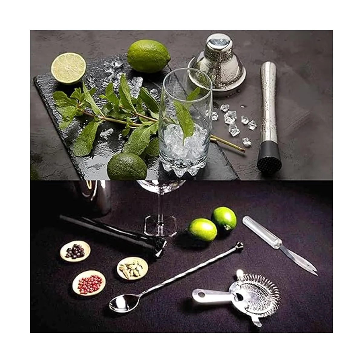 Juego de bar sencillo: el juego de élite es la elección para principiantes que quieren aprender a hacer grandes bebidas. Viene con una coctelera de 18 onzas que es fácil de quitar y a prueba de fugas. Todas las herramientas de camarero son de acero inoxidable y aptas para lavavajillas.