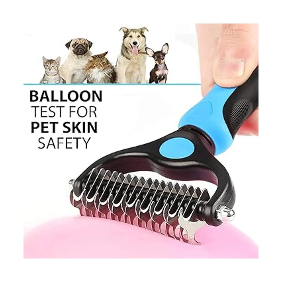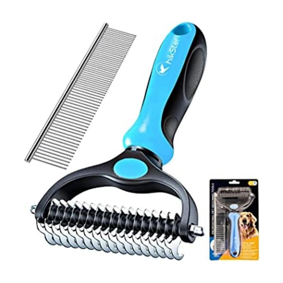 Hikster Rastrillo de capa interior para perros y gatos con peine para mascotas, cepillo de aseo de mascotas, herramienta de desenmascaramiento para perros de doble cara que elimina nudos y cabello enredado, peine para perros con peine de perro para aseo conjunto, azul