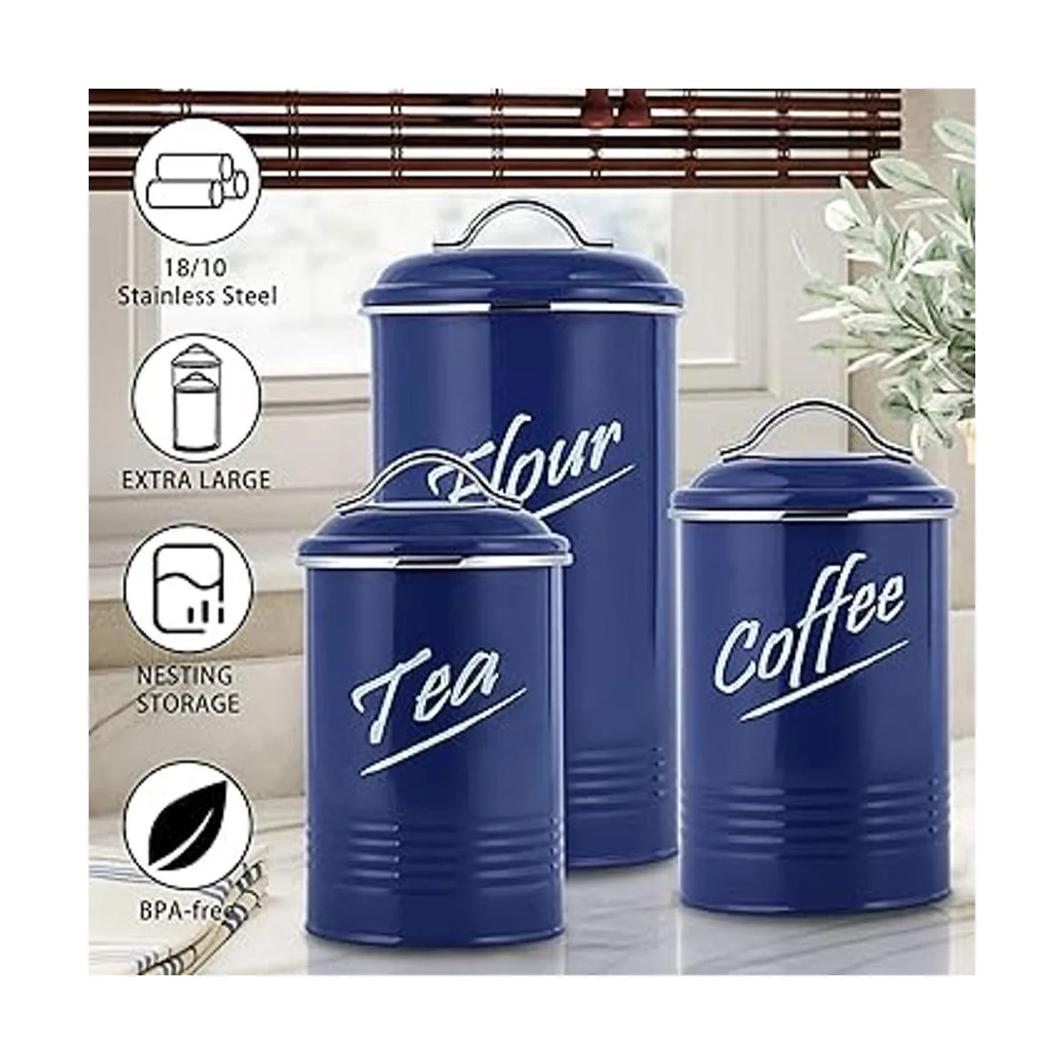 Material de alta calidad El juego de recipientes decorativos tiene un elegante acabado brillante con recubrimiento en polvo y está hecho de acero inoxidable 18/10 de alta calidad que es ideal para el almacenamiento de alimentos; libre de BPA, pintura y ftalatos, no libera productos químicos nocivos ni olores.