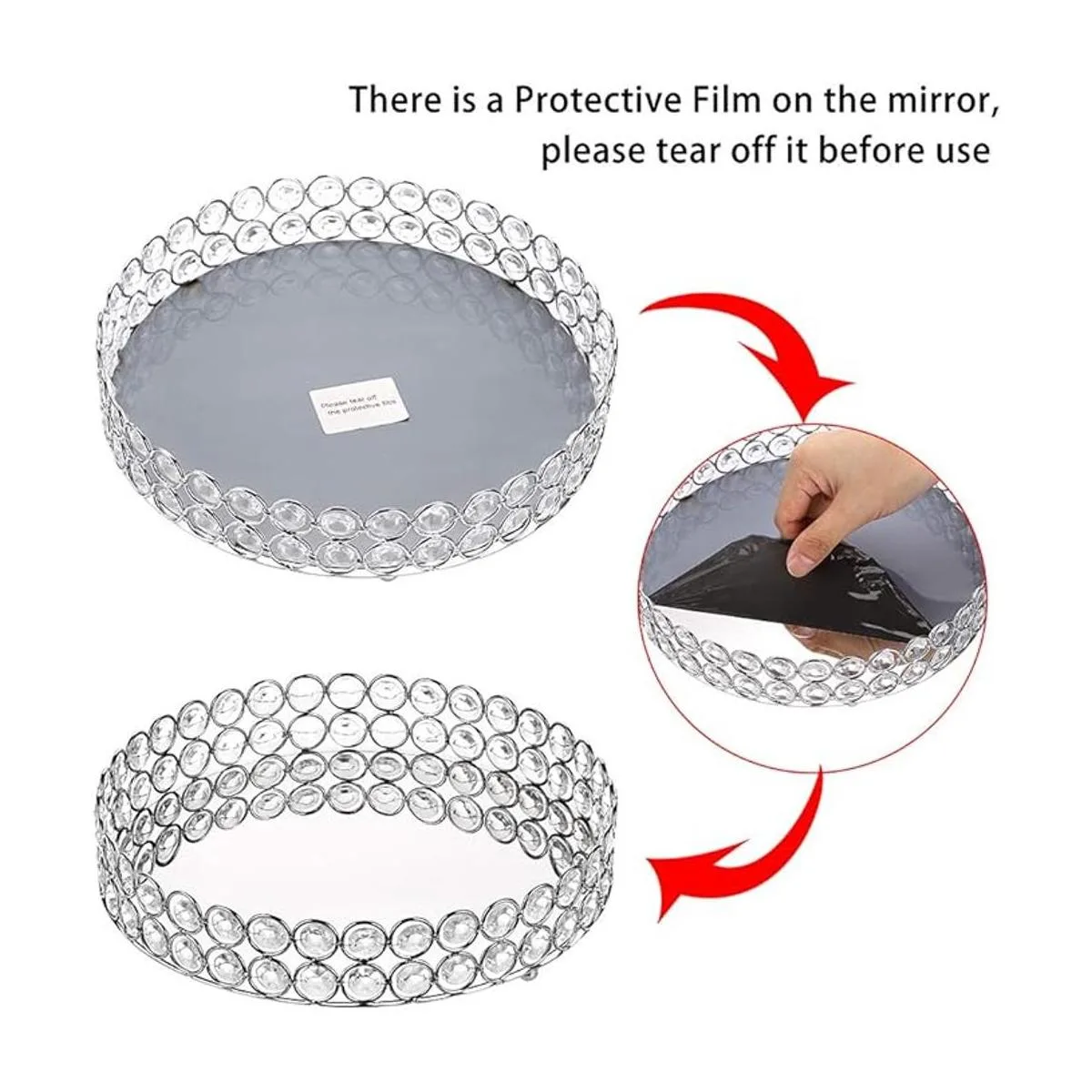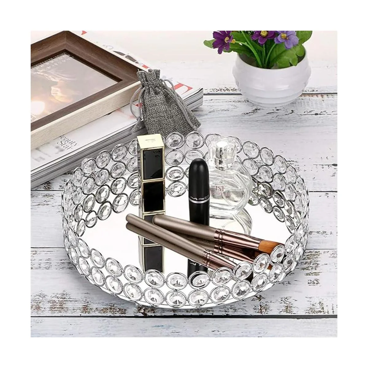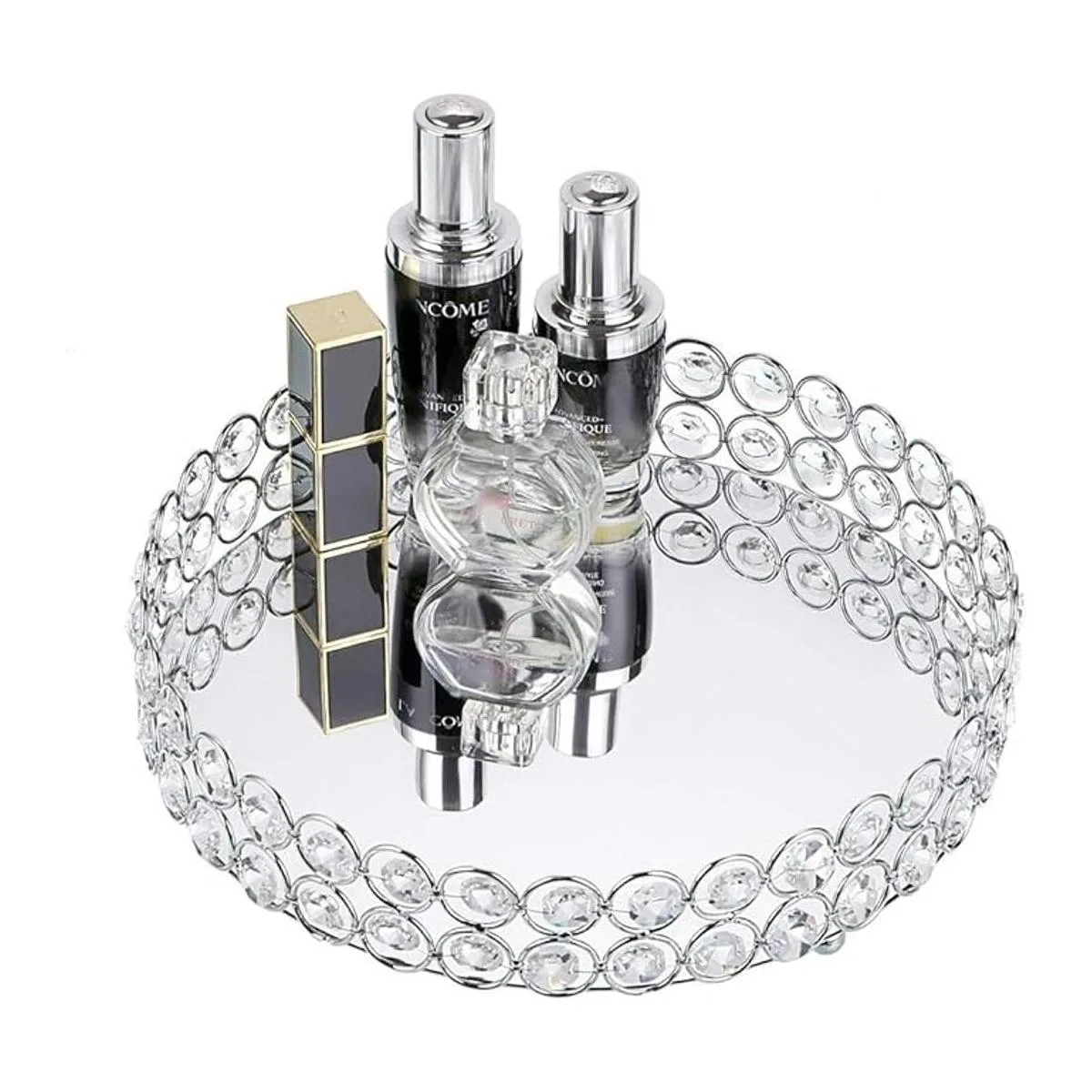 Exquisita bandeja de cristal: esta bandeja de maquillaje está hecha de cristales brillantes intrincadamente tejidos en anillos de metal alrededor de una hermosa base de espejo. El cristal brillante de dos capas hecho a mano se ve hermoso, la bandeja de superficie de vidrio con espejo con impresionante base hace que sea más única