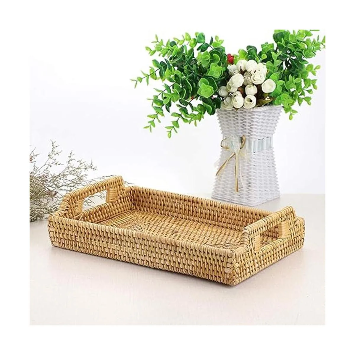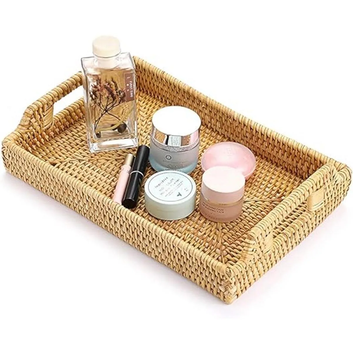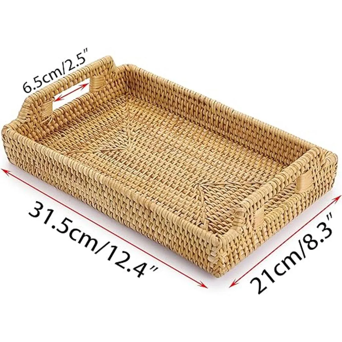 Hipiwe Bandeja organizadora de ratán con asas, bandeja decorativa tejida a mano para almacenamiento de desayuno, bebidas, aperitivos, bandeja organizadora rectangular para mesa de café, decoración del hogar pequeña