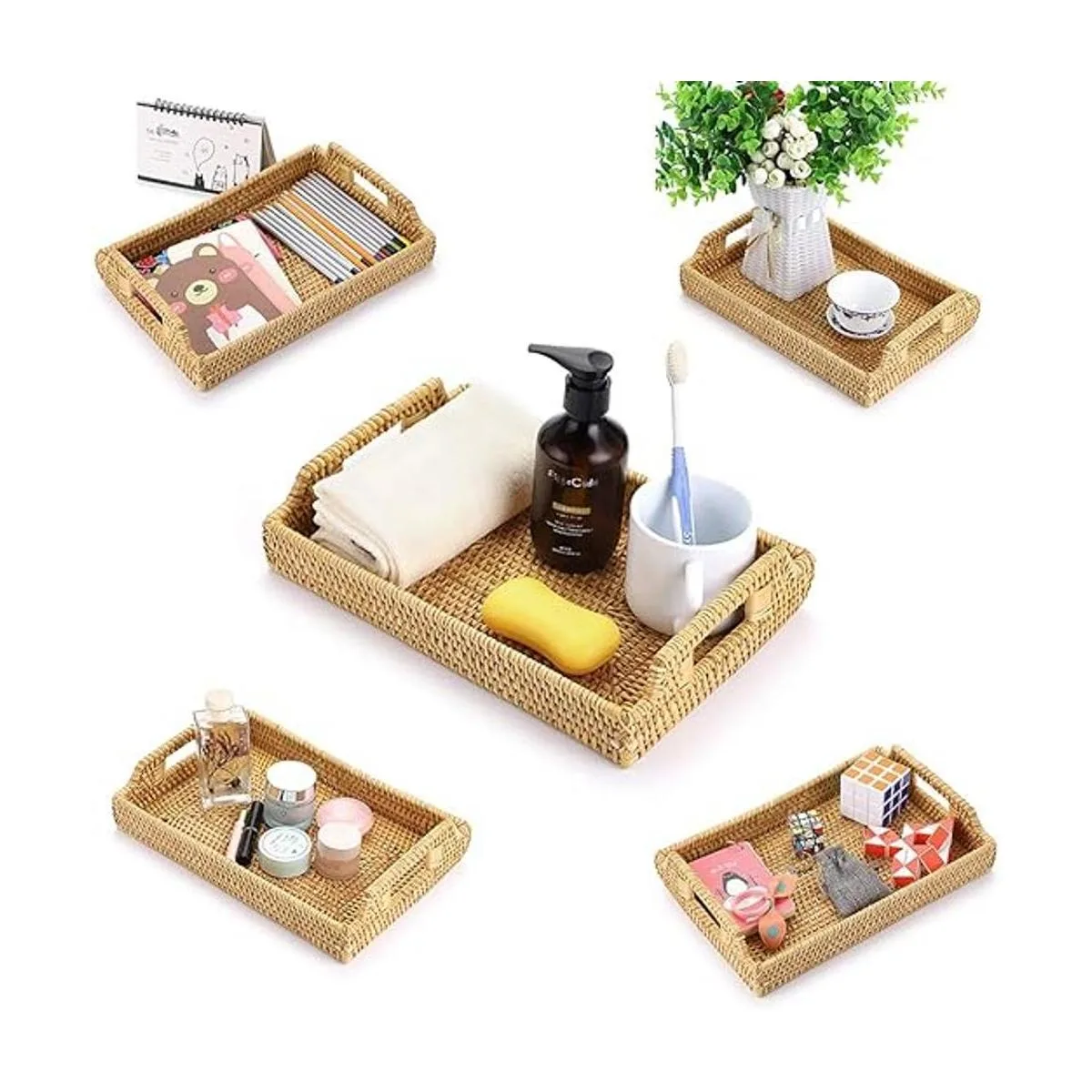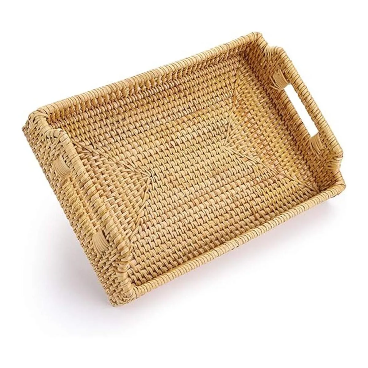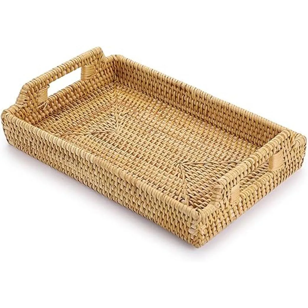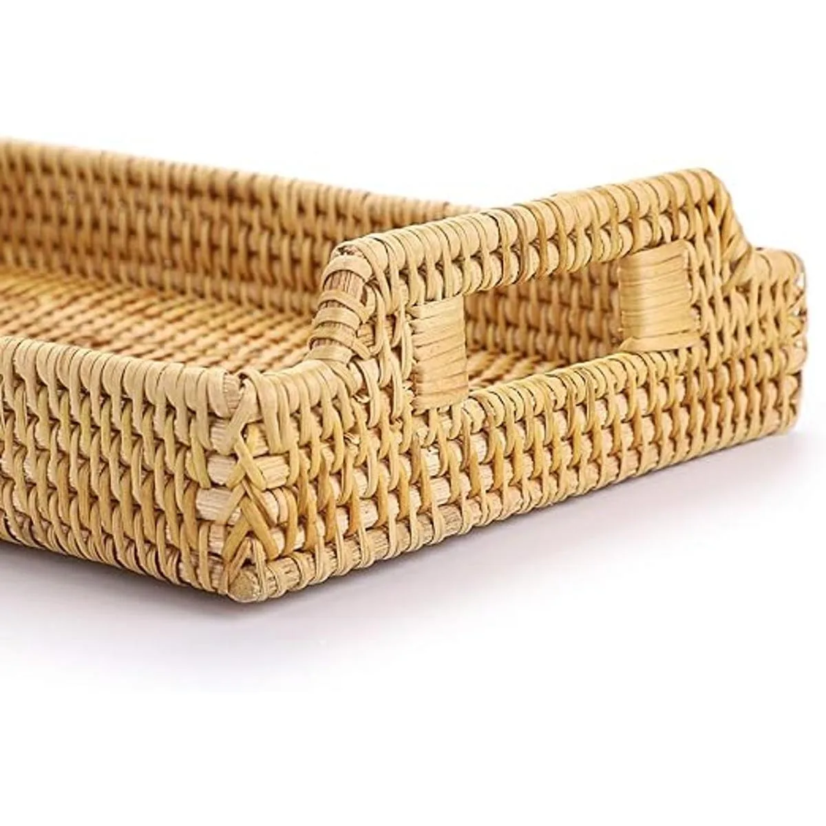 Hipiwe Bandeja organizadora de ratán con asas, bandeja decorativa tejida a mano para almacenamiento de desayuno, bebidas, aperitivos, bandeja organizadora rectangular para mesa de café, decoración del hogar pequeña