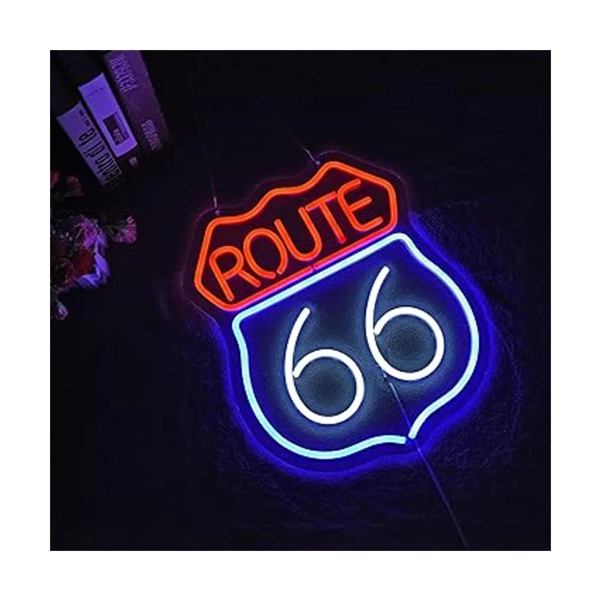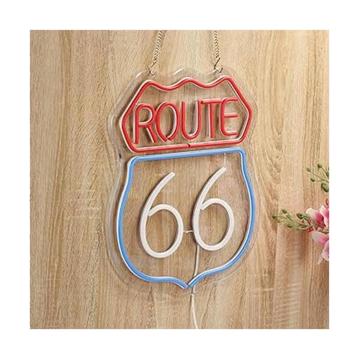 Letrero de neón Route 66 hecho de tira de luces LED de silicona flexible y fijado en un tablero acrílico transparente.