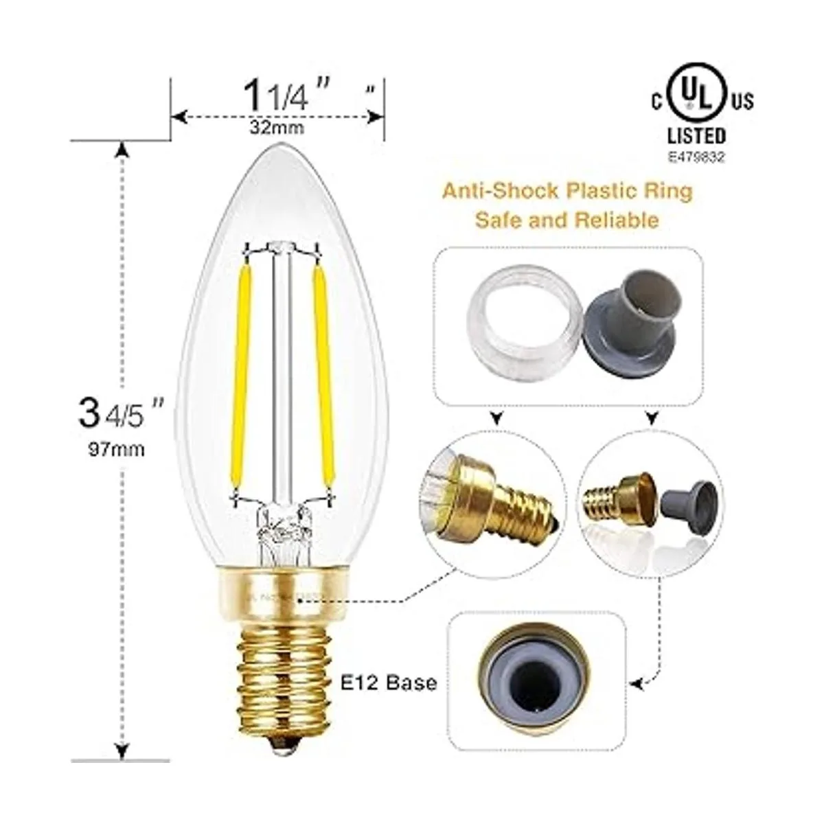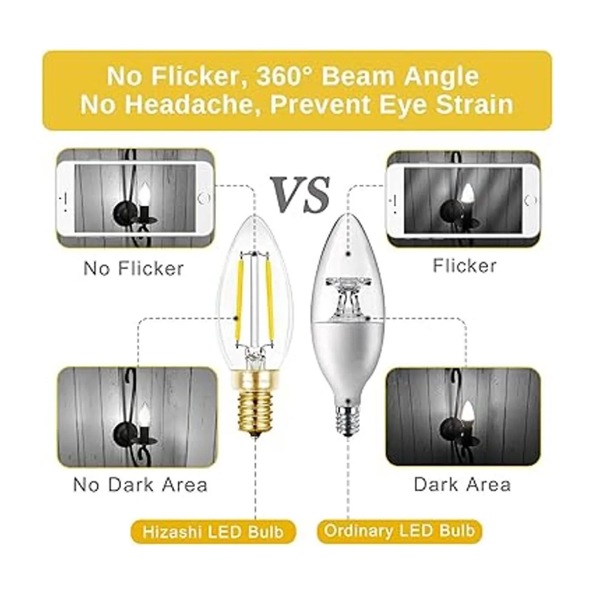 Hizashi Paquete de 12 bombillas de filamento LED CRI de 2 W 2 vatios totalmente regulables de 90 CRI de 5000 K, equivalente a 2025 vatios, 200 lúmenes, bombillas LED B10, enchufe E12 de luz diurna de 5000 K para candelabro, título 20, certificación UL