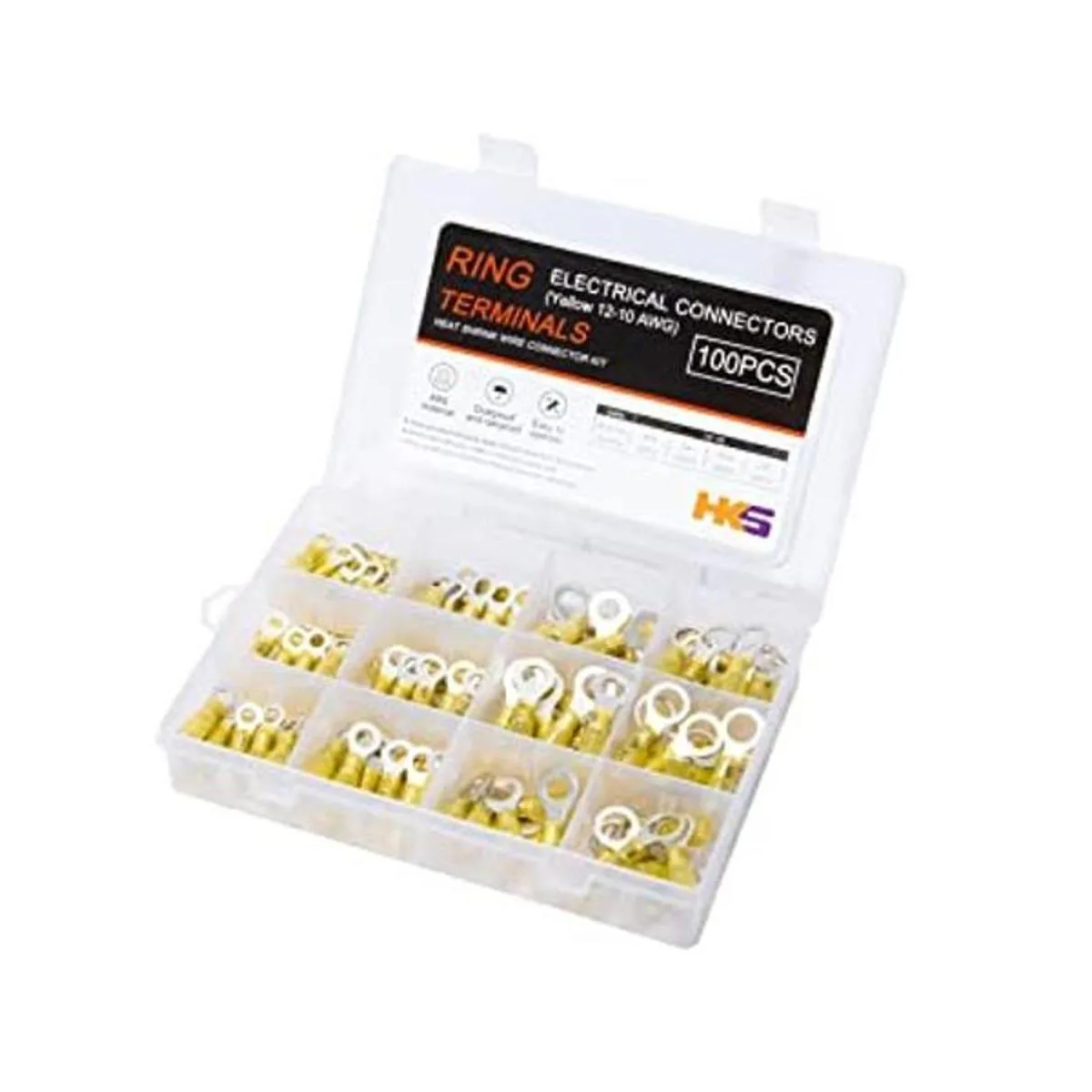 HKS 100 terminales de anillo termoencogible, amarillo 1210 AWG, cobre rojo estañado de 0.039 in, 4 tamaños 10,14 pulgadas, 516 pulgadas, 38 pulgadas, kit de conectores de cable eléctrico marino, juego de terminales de crimpado impermeables y aislados
