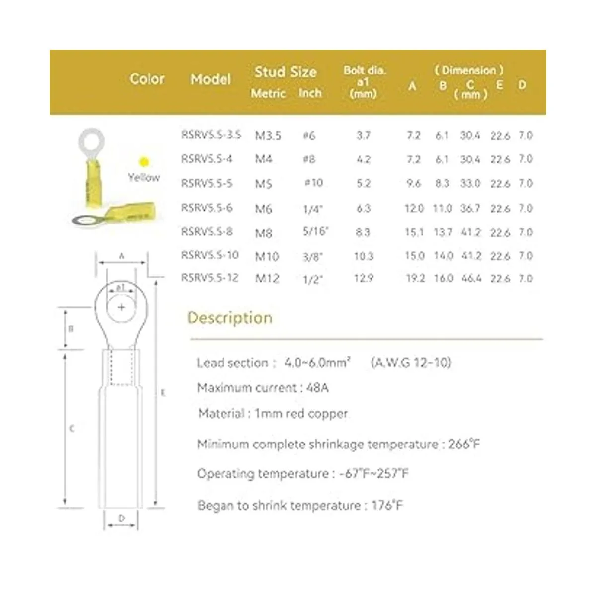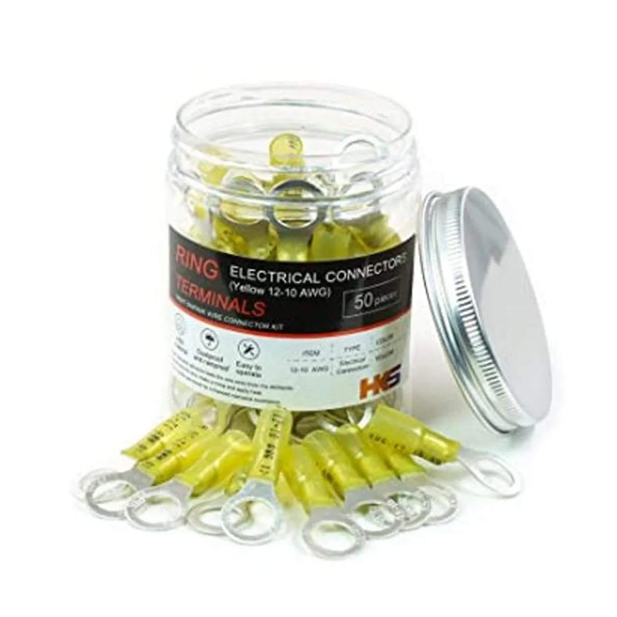 HKS 50 terminales de anillo de 38 pulgadas, amarillo, 1210 AWG, M10, conectores eléctricos, kit de conectores de cable termoencogible, cobre rojo estañado, conectores de anillo marino automotriz, impermeables y aislados