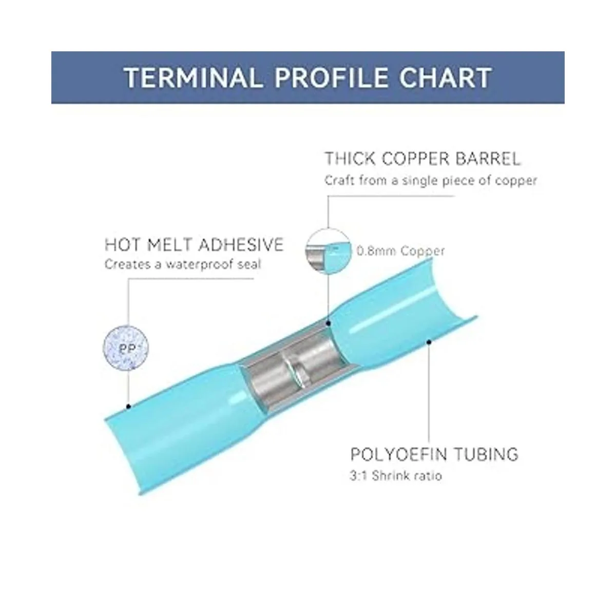 Barril de cobre rojo El barril de cobre estañado de 0.039 in de grosor garantiza un fuerte engarce de alambre. El conector de cable termorretráctil puede sujetar completamente los cables, el cable nunca se deslizará fuera de los terminales de cable eléctrico. El tubo termorretráctil con forro adhesivo proporciona una alta resistencia a la tracción, resistencia al estiramiento climático y daños mecánicos.