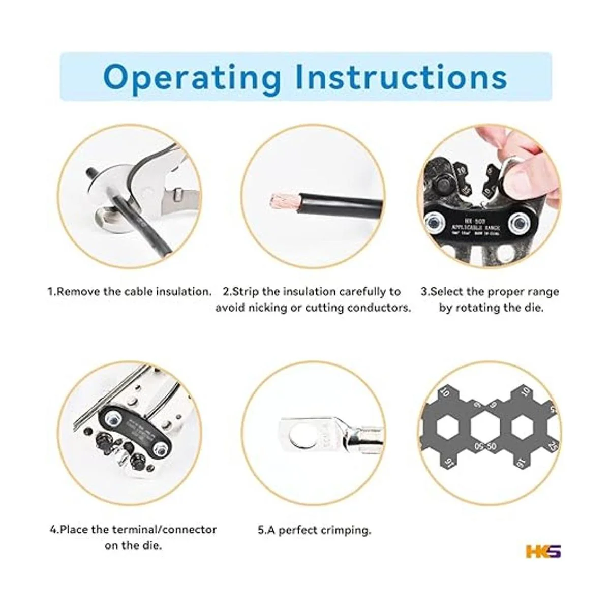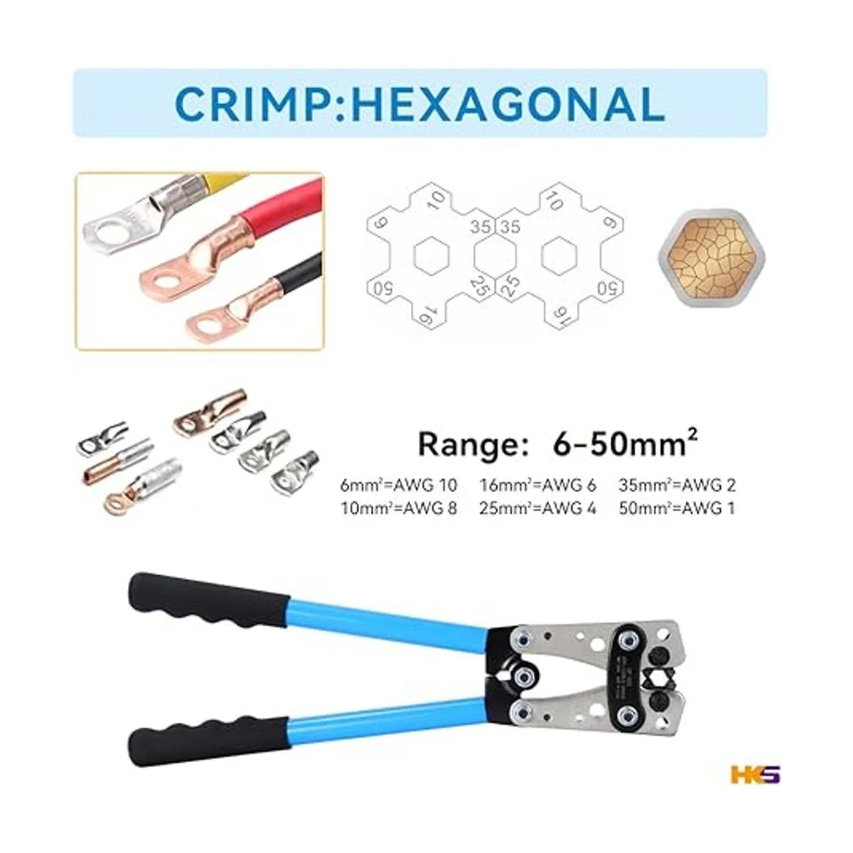HKS Herramienta engarzadora de terminales de cable de batería, 101 AWG con 60 terminales de anillo de cobre, juego de agarraderas de cable de 8 tamaños, engarzador de cable resistente para terminal de cable de batería