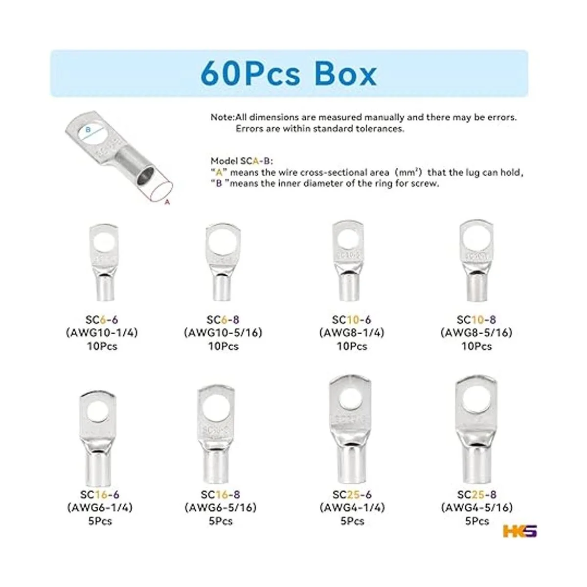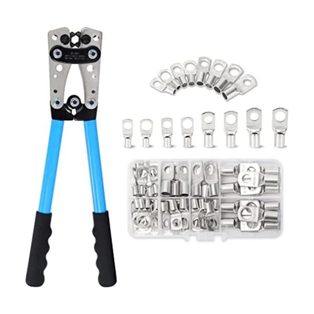 Contenido del paquete: 1 herramienta engarzadora de cable de batería, 60 terminales de anillo de cobre con caja