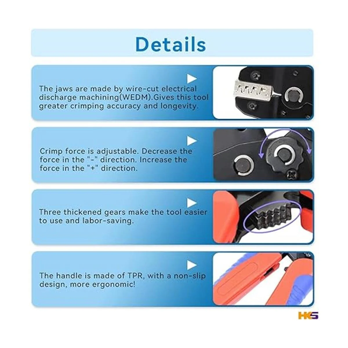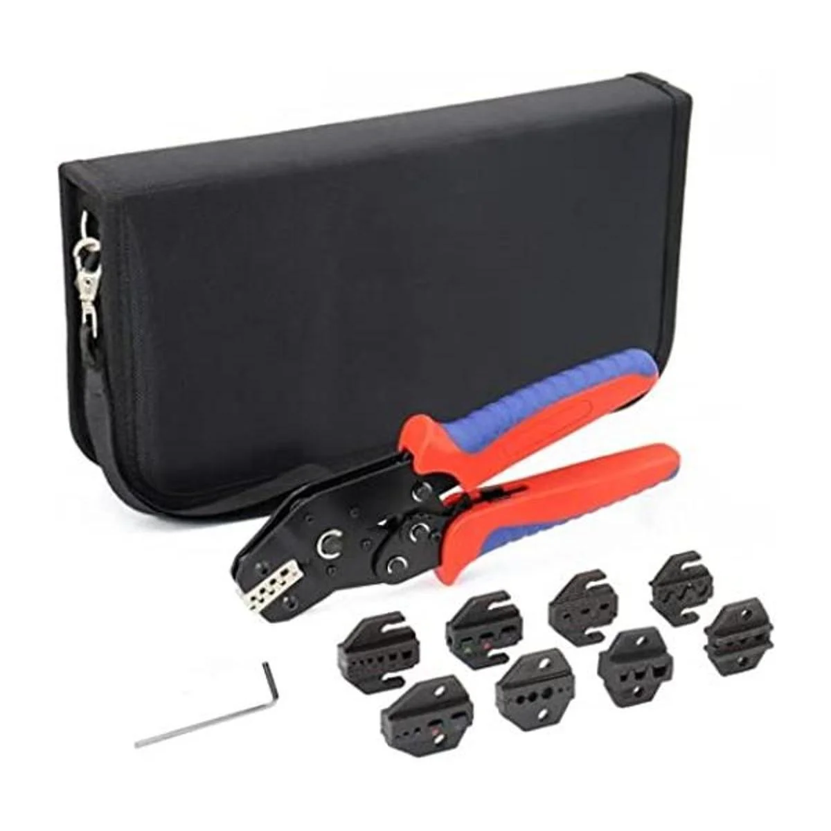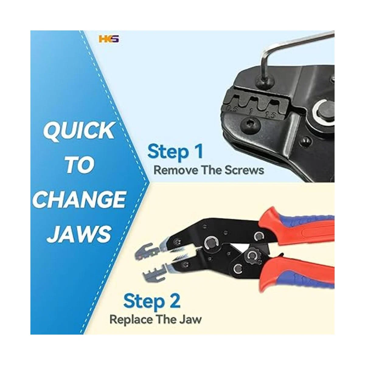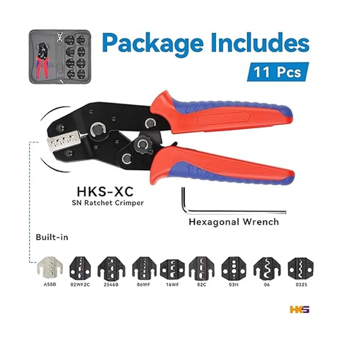 HKS Juego de herramientas de prensado de trinquete de 11 piezas con mordazas intercambiables para Dupont JST MOLEX Terminales de barril abierto, virolas aisladas y no aisladas, terminales y conectores a tope, conectores MC4 y coaxiales