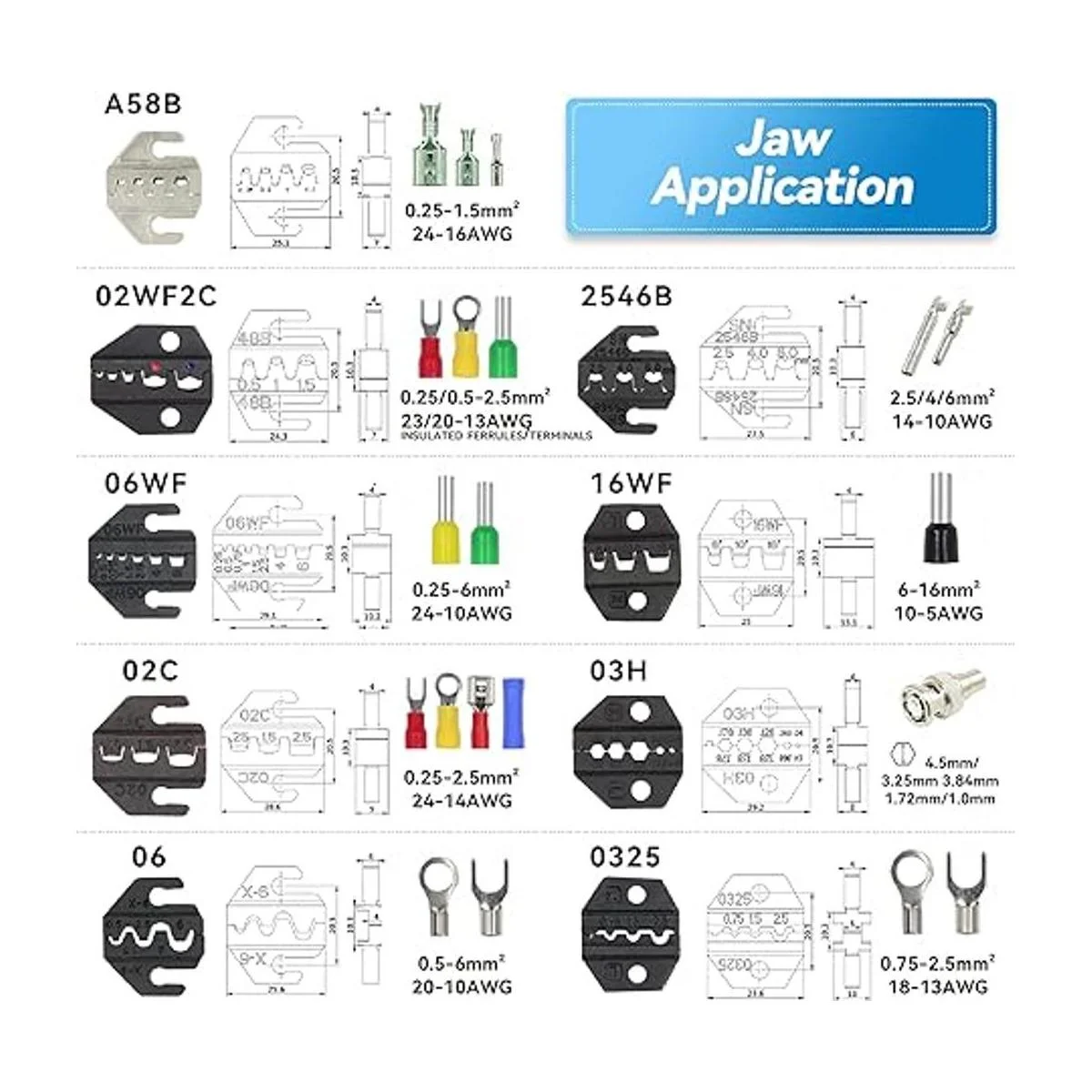 Versatilidad: 9 mandíbulas para terminales de barril abierto para Dupont, JST, TE, MOLEX, etc. , conectores Dsub, conectores KF 2510, ATX, EPS, PCIE, SATA 2.54/3.96/4.8/5.08/6.3mm, virolas aisladas y no aisladas, conectores de tope, conectores MC4, conectores de cable coaxial.