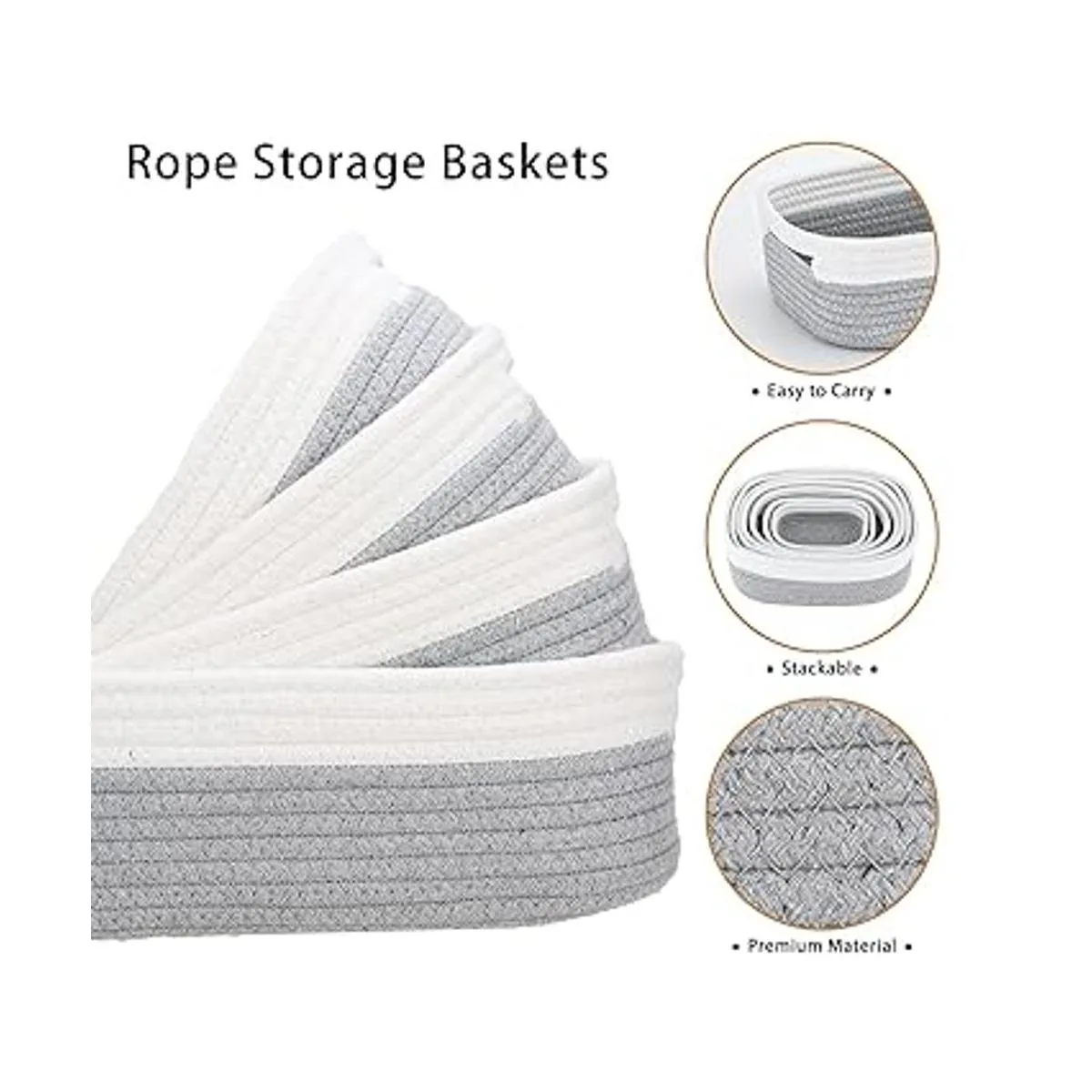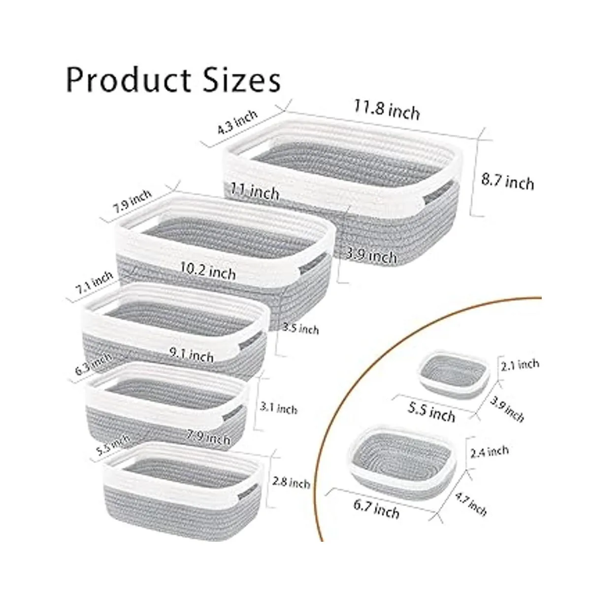 Alta capacidad: este juego de cestas viene con 2 prácticas cestas pequeñas para proporcionar más espacio de almacenamiento. Encuentra el lugar perfecto para todos tus suministros desordenados. Este juego de 7 cestas de cuerda de tela se puede utilizar para organizar mantas, toallas, ropa, libros, juguetes para mascotas. La cesta pequeña incluida es perfecta para guardar llaves, joyas y accesorios. Tamaño: 11.8 x 8.7 x 4.3 pulgadas, 11 x 7.9 x 3.9 pulgadas, 10.2 x 7.1 x 3.5 pulgadas, 9.1 x 6.3 x 3.1 pulgadas, 7.9 x 5.5 x 2.8 pulgadas, 6.7 x 4.7 pulgadas.