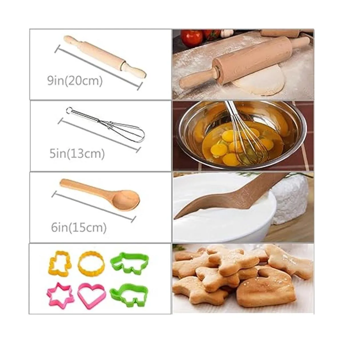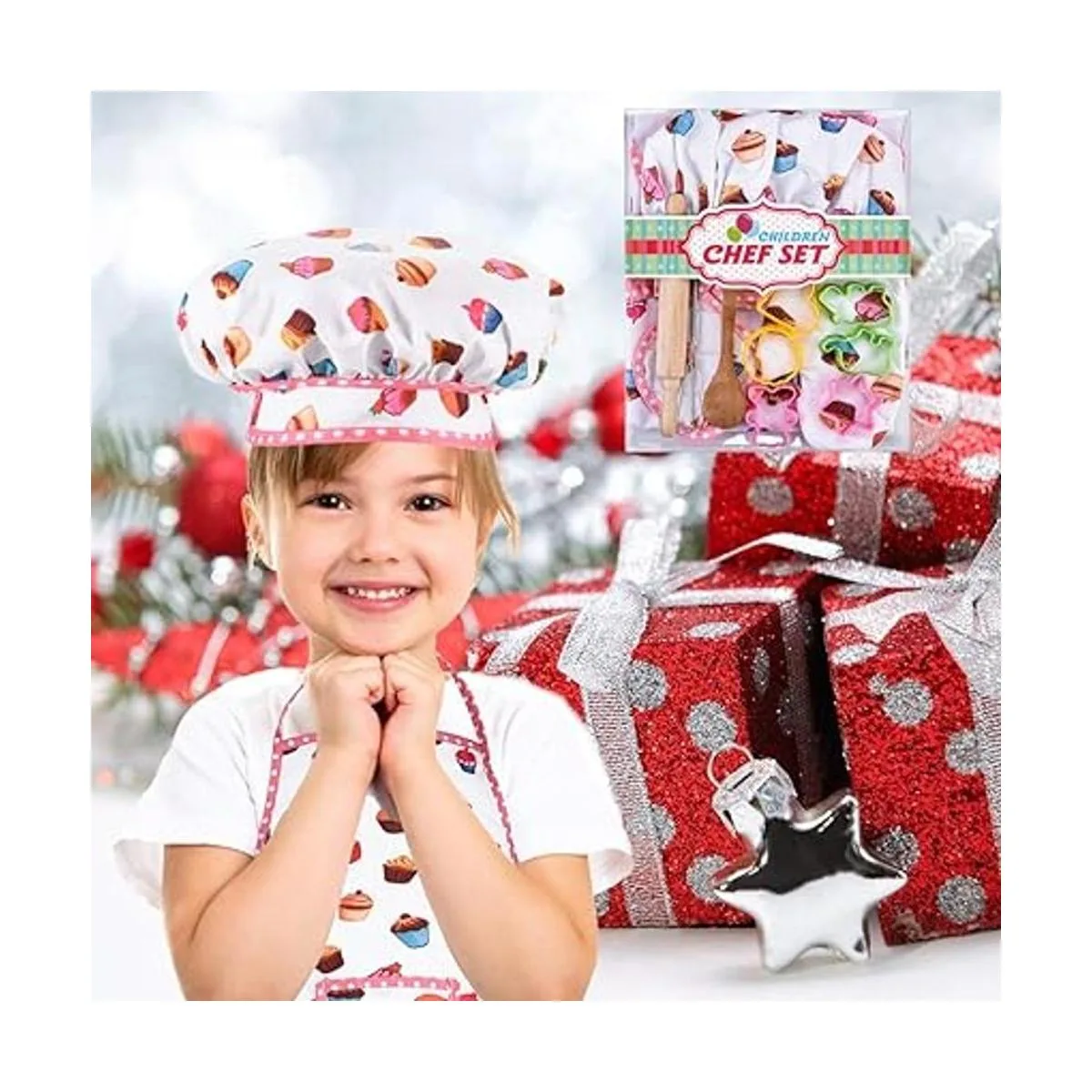 Juego de 13 piezas de cocina y horneado para niños: adorable sombrero de chef, delantal para niños, guante de horno, alfombrilla resistente al calor, cuchara, rodillo y 6 moldes de plástico personalizados para galletas. El juego de chef para niños incluye todo lo que el juego de rol necesita.