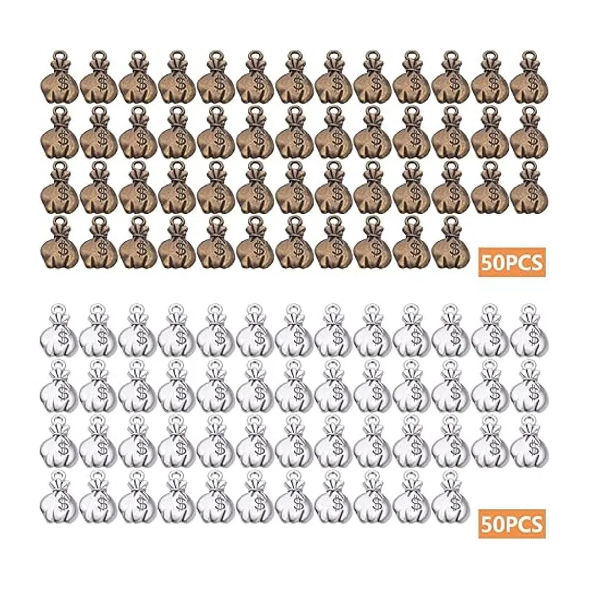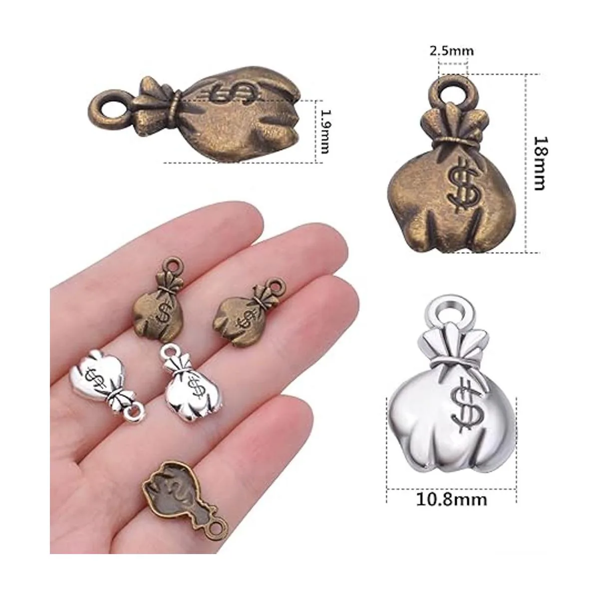Cantidad suficiente: el paquete viene con 100 abalorios de bolsa de dinero en total, 2 colores plata antigua y bronce antiguo, 50 piezas para cada color. Tamaño: 0.709 in x 0.425 in x 0.075 in, el orificio: 0.098 in